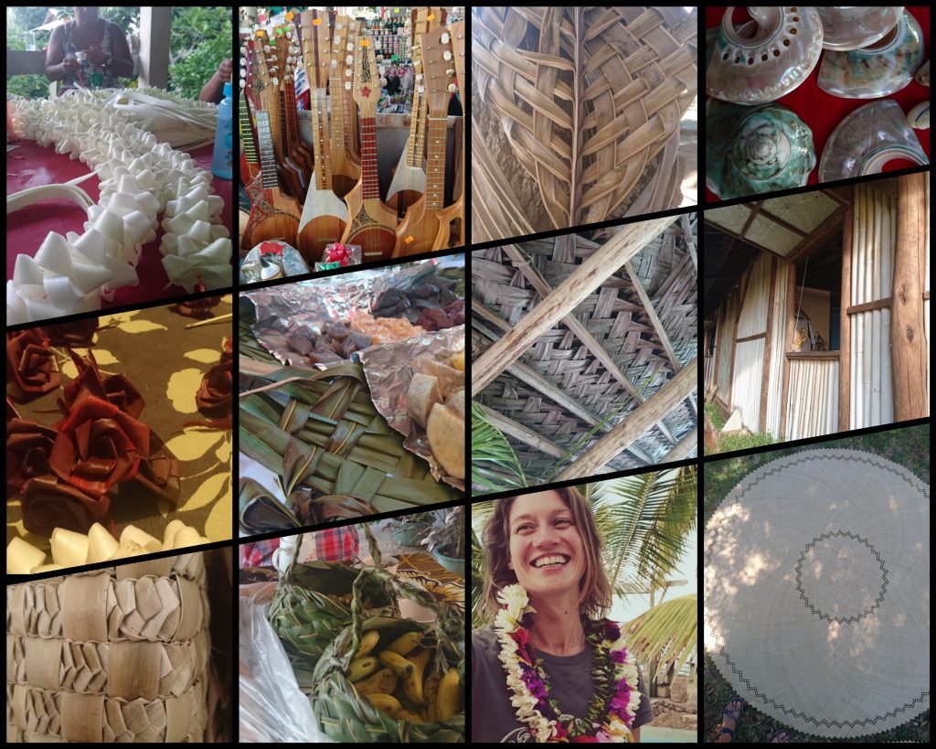 Kunsthandwerk in Tahiti. Aus Blumen, Pflanzenfasern, Blüten, Blättern, Muscheln, Samen etc.