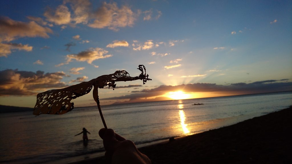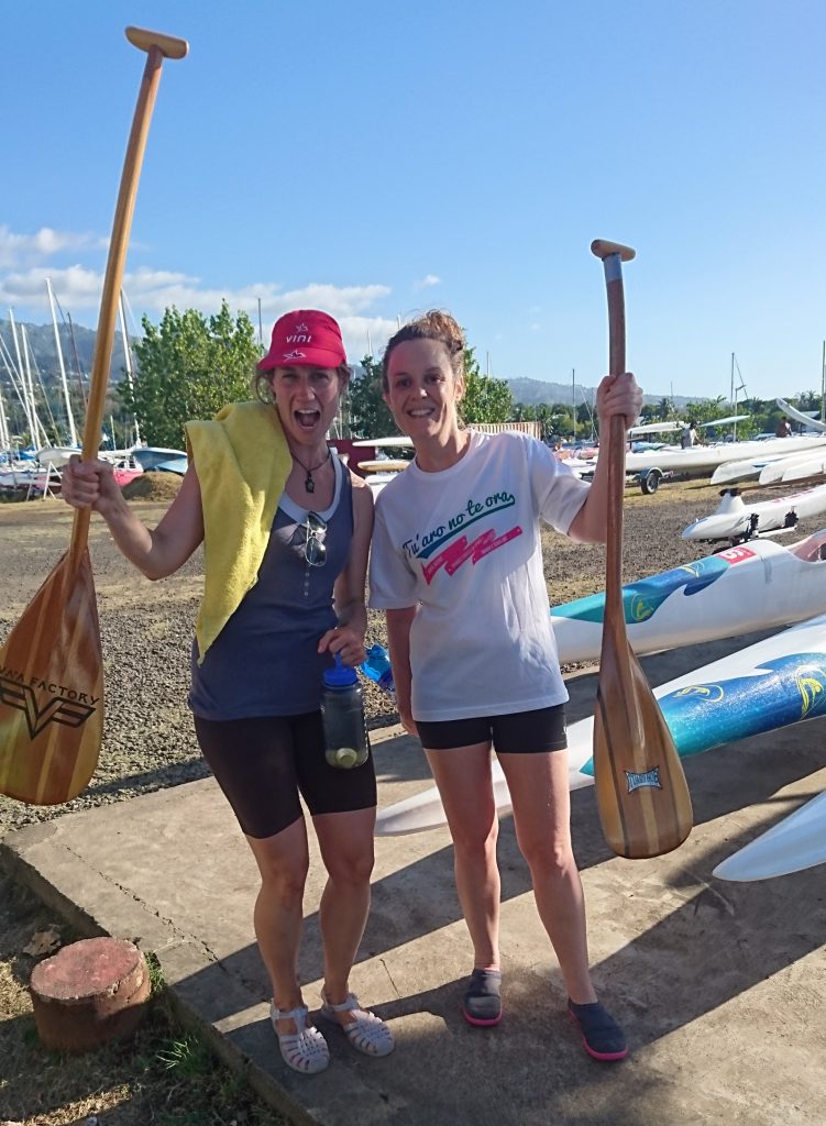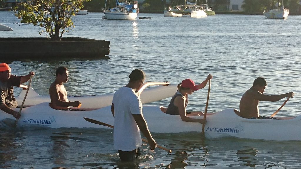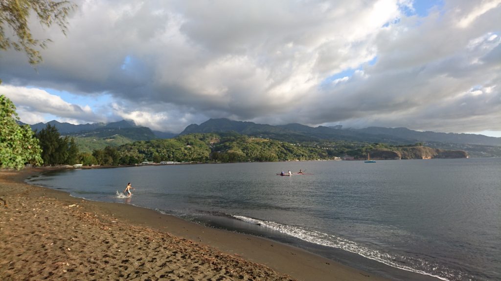 Den ersten Tag gönne ich mir einen Ruhetag, abends gehen wir zum Strand. Schwarzer, weicher Sand, überall im Wasser lungern die Hoe-Jungs auf ihren Kanus. Frechheit! Tahiti ist der Hoe-Olymp, der Sport heißt hier allerdings Va’a und ich sitz neidend am Strand und schaue ihnen hinterher.