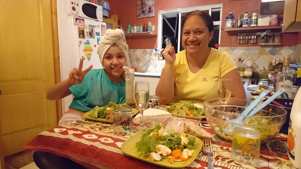 Eine weitere interkulturelle Beobachtung machte ich im Laufe der Zeit auch über das Teilen. Ich lernte, dass es auch zu diesem Begriff unterschiedliche Auslegungen gibt. Eigentlich denkt man ja, teilen heißt teilen. Ganz einfach. Jeder bekommt was ab und zwar in möglichst ähnlichen Mengen. Aber in Polynesien heißt es schon man teilt, wenn der eine viel kriegt, der andere wenig, oder der eine zahlt und alle anderen nehmen sich davon. Zumindest war es so in Leonies Haus. Ob man davon auf ganz Polynesien schließen kann, weiß ich ja nun auch nicht…Leonies Kinder sind ja in verschiedenen Kulturen (Französisch Polynesien, Osterinsel/Chile) aufgewachsen – insofern ist das vielleicht auch ein konfundierter Mischmasch – oder es lag an der Größe der WG. Mir fiel auf, dass beim Essen in der Regel Schnelligkeit gefragt war – bei Bier sowieso, haha. Mein Vater, der in der Regel die größeren Einkäufe erledigte und somit zwangsweise auch zahlte, hatte oft damit zu hadern, dass Dinge, auf die er sich schon gefreut hatte, wie ein kaltes Bier oder eine gute Schokolade, aus dem Kühlschrank einfach blitzschnell verschwanden. Ein Kasten Bier kostet ein regelrechtes Vermögen, beinahe 50 Euro! Und bei etwa 10 Biertrinkern ist der Konsum dann kaum zu bremsen, kaum ist der Kasten da – so schnell kann man gar nicht gucken, da ist er schon wieder leer! Da bekam mein armer Dad häufig gar keins mehr ab – was ihn natürlich ärgerte, weil selten jemand anderes auf die Idee kam das Bier zu kaufen. Doch Leonie erklärte uns, dass bei ihr schon immer gegolten habe, jeder könne sich in der Küche stets von allem bedienen und niemand käme auf die Idee sich zu ärgern, wenn für ihn nichts mehr übrig bliebe. Sie meinte sogar, man solle Dinge gar nicht erst kaufen, wenn man nicht auch teilen könne. Aber uns ging ja gar nicht darum, dass wir nicht teilen können, sondern, dass wir nicht begriffen, warum so wenig Rücksicht und Achtsamkeit auf die anderen genommen wurde. Wenn wir Essen vom Vortag aßen, achtete ich stets darauf, mir nur so viel zu nehmen, dass für jeden was übrig war. Einmal hatten wir gegrillt und es waren etwa 5 Spieße übrig. Für mich stand fest: ich esse nur einen halben, damit jeder einen halben Spieß bekommt. Ich sah sogar meinen Vater noch vorwurfsvoll an, als er sich „zu viel“ nahm. Doch kaum hatten wir uns versehen, lagen die restlichen Spieße bei 3 Leuten auf den Tellern und was seh ich da! Einer nahm sich sogar zwei ! Sie fielen gierig über sie her und verschwendeten offenbar keinen Gedanken daran, ob für alle etwas Spieß da sei. Wie Spießig! Ha Ha. Da bekommt man glatt Futterneid!