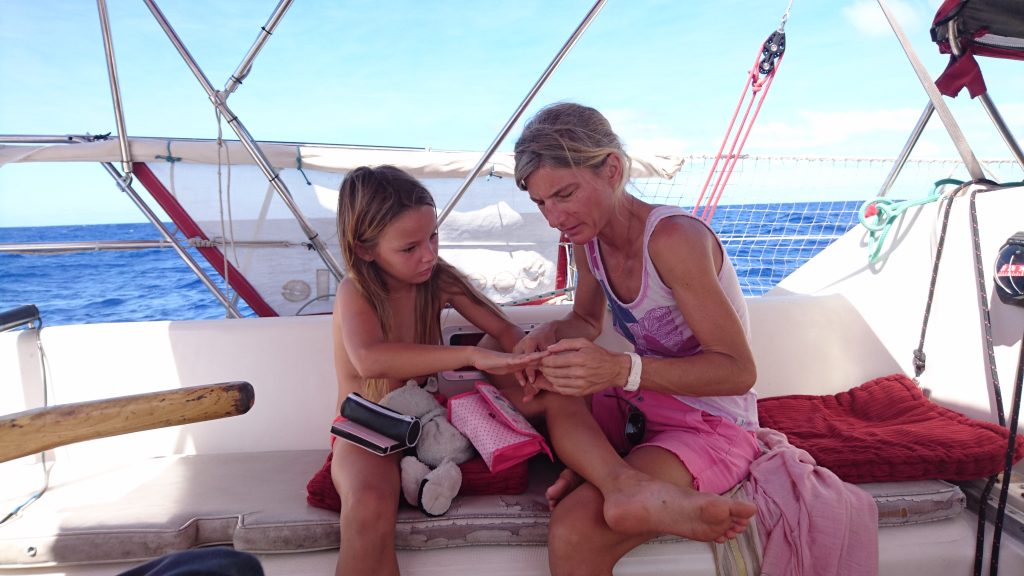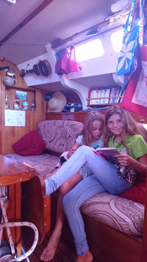 Wir unterhalten uns mindestens 20 min. Franz ist 70, gut gelaunt und jung geblieben, kommt aus der Schweiz und segelt seit 10 Jahren um die Welt. Viele Jahre alleine und seit bald zwei Jahren mit seiner Tochter Sandra. Leider fährt er weder nach Raiatea, noch später nach Neuseeland, aber er hat einen guten Seglerfreund, ein Deutscher, der gerade Richtung Neuseeland aufgebrochen ist und vllt irgendwo auf mich warten kann. Franz meint der wäre sicher entzückt eine deutsche Wandersgesellin dabei zu haben und wird sich bei mir melden. Na, das ist ja schonmal was, aber wie komm ich denn jetzt zur Hochzeit?Am Mittag meines zweiten Lauertages, ich habe bereits Sonnenbrand und eine wunde Zunge vom viele Menschen ansprechen (gefühlt kenne ich inzwischen jeden, der hier vor Anker liegt), lerne ich endlich Gilles aus Frankreich kennen, der tatsächlich nach Raiatea segelt. Wann? Morgen. Mit seiner Familie. Er telefoniert kurz, fragt seine Frau, ob ich mit darf und Wow! Er nickt und sagt es wäre ok! Boa, wie ich mich freue! Ich fühle mich mal wieder ziemlich unbesiegbar, haha. Naja, nach fünf Wochen vergeblicher Liebesmüh in Valparaiso ist es ja auch irgendwie gerecht, dass ich jetzt nach anderthalb Tagen ein Boot finde.