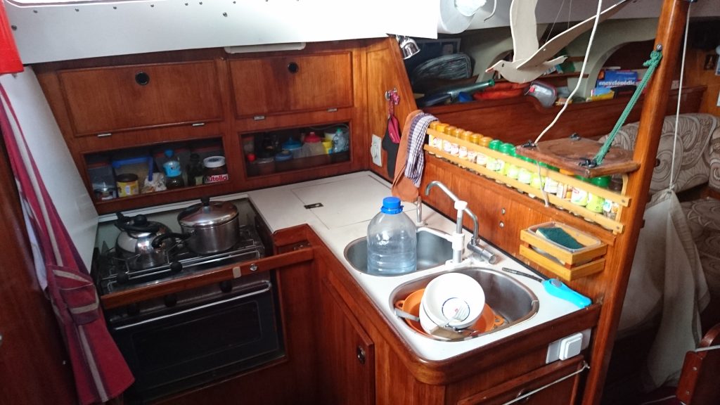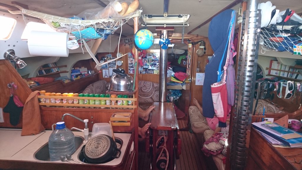 Wir steigen hinten aufs Boot und treten sofort auf das „Freiluftwohnzimmer“, wo die Sitzbänke ein U um die Steuerpinne bilden. Gegenüber ist die Hühnertreppe, die nach unten führt. Ich stecke von oben neugierig den Kopf durch und blicke in den Rumpf. Ist das gemütlich!!! Die Mädels sind schon längst unten und rufen mich aufgeregt dazu, sie wollen mir eine Führung geben. Wie Franzosen so sind, halten sie es für unnötig langsamer oder deutlicher für Anfänger wie mich zu sprechen. „Hier links ist unsere Fünfsterneküche, dort rechts das beste Büro der Welt.“ Dahinter, in der Mitte des Bootes ist die gemütliche Sitzecke, eine Ukulele hängt an der Decke, ein Globus auf dem markiert ist, wo sie schon überall waren, aus aller Welt hängen kleine Erinnerungsstücke und Fotos. Camille läuft durch bis ganz vorne „das ist mein Zimmer und hier ist auch unsere Toilette.“ Camilles Zimmer ist urgemutlich, wie eine kleine Höhle die sich an die Bootsform anpasst, eine dreieckige Matratze liegt darin auf der man auch zu zweit schlafen kann, nur Füßeln muss erlaubt sein. Sie ist die Ältere und hat Fotos von sich und ihren Freundinnen an die Seiten geklebt. Wir gehen wieder zur Leiter, rechts und links sind wieder zwei Kajüten, beide so, dass zwei Leute darin schlafen können, die jeweils äußere Wand ist schräg wie eine Lehne, die innere Seite hat eine tiefere Decke, dort passen nur die Beine drunter, denn darüber sind die Bänke des Freiluftwohnzimmers. So ist das ganze Boot perfekt verschachtelt. Es gibt Staukammern, Lampen, kleine Fenster. Die Küche erstaunt mich mit dem Vorhandensein eines Kühlschranks und einem Wipp-Herd, damit man auch bei Seegang immer im Lot kocht und nichts verschüttet. Und sogar ein Ofen! Ich bin hin und weg. Ich hatte ehrlich gesagt nicht damit gerechnet, dass man einen Kühlschrank (und sogar ein Eisfach!) hat. Der verbraucht doch soviel Strom! In der Zwischenzeit ist nun auch Armelle angekommen, Gilles‘ Frau. Sie begrüßt mich und meine erster Gedanke, als ich ihren Gesichtsausdruck sehe ist, au weia, das ist so eine harte Nuss. Für mich ist sie eine typische Französin: eine schöne Frau, schlank in einem Alter, wo deutsche Frauen meist schon aufgegangen sind; wie machen die das bloß? Sie wirkt sehr streng, ernst, hart und hat so eine lauernde unterschwellige Aggressivität in sich. Ob sie es wohl doof findet, dass Gilles mich angeschleppt hat? Sofort bricht Aufbruchstimmung ein, ich soll mein Gepäck in die linke Kajüte tun, dort wo eigentlich das Ehebett ist. Da fühl ich mich gleich schlecht, denn Gilles und Armelle werden folglich im Salon auf den Sofas schlafen. Ist Armelle deswegen sauer? Ich biete mehrfach an selber auf dem Sofa zu schlafen, aber sie erklären mir, dass es normal sei, dass sie während längerer Überfahrten dort schliefen, wegen der Nachtschichten und um schneller oben zu sein, wenn was wäre. Also gut. Es wird noch schnell getankt und „ausklariert“, also bei der Hafenbehörde abgemeldet und schon sind wir unterwegs.
