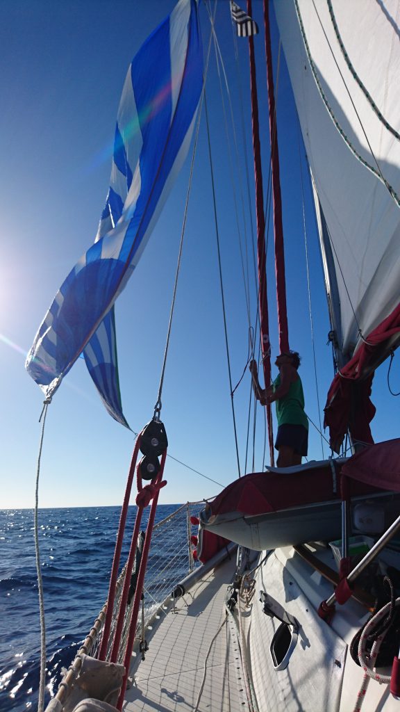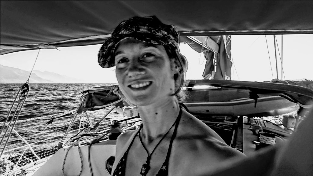 Innerlich bin ich schon ganz aufgeregt wegen meiner ersten Segelfahrt. Trotz all der positiven Erwartungen, habe ich mir noch Tabletten gegen Seekrankheit besorgt. Ich will bloß nicht negativ auffallen. Gilles kommt pünktlich zum Treffpunkt und mit seinen Töchtern Apolline und Camille fahren wir auf dem Dinghi heraus. Ist das aufregend! Es liegen bestimmt hundert Segelboote vor Anker, welches ist wohl unseres? Schließlich steuern wir auf ein weiß-rotes Segelboot zu, es ist etwa 11m lang und heißt „Coccinelle“, Marinchenkäfer. Das ist doch süß! Vom ersten Tritt aufs Boot an bin ich absolut fasziniert. Es gibt so viel zu sehen auf so kleinem Raum. Jeder Quadratzentimeter ist perfekt durchdacht, sinnvoll designed und für irgendetwas belegt. Man erkennt und spürt auf Anhieb, dass Bootsarchitektur eine Königsdisziplin ist. Auf einmal denke ich mir, da hätte ich mich schon viel früher mit beschäftigen sollen, da gibt es sicher viel, was man hätte fürs Studium übertragen und nutzen können.