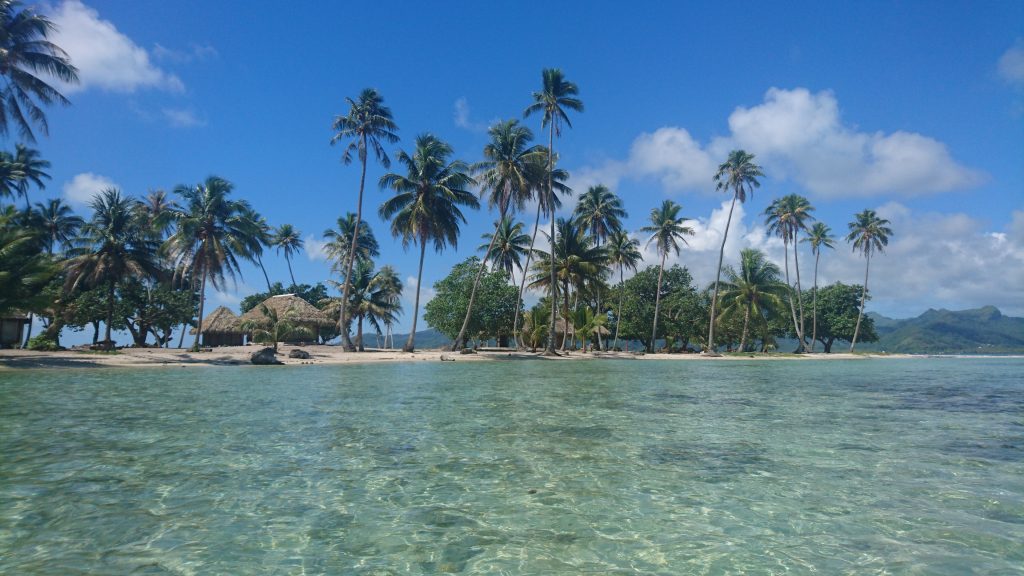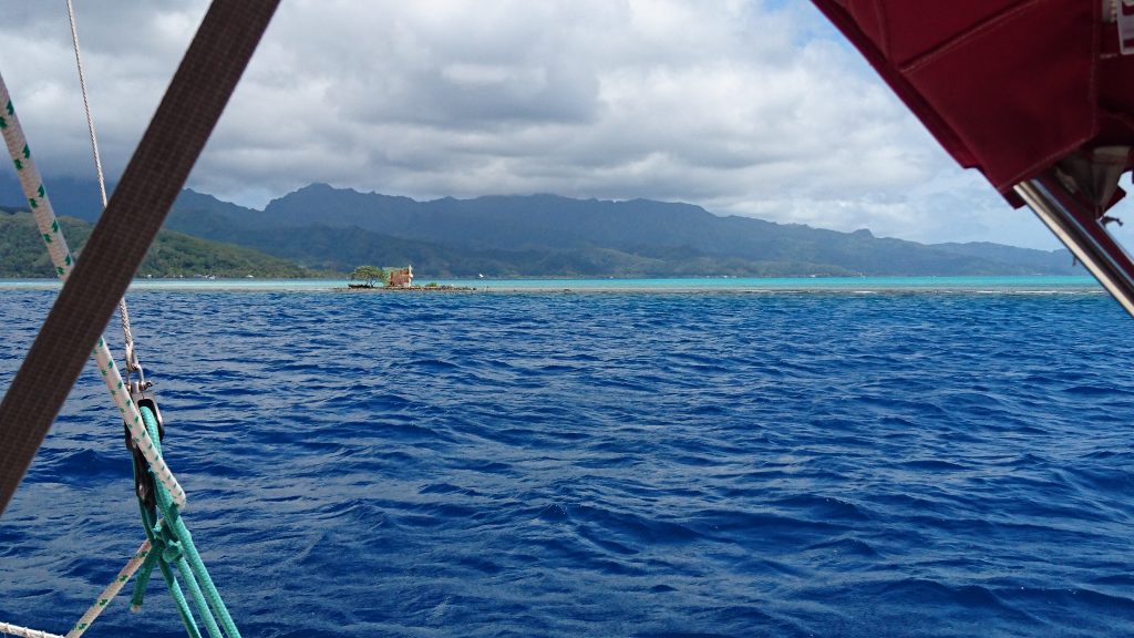Die Insel in der Ferne ist Huahine (Wua-hineh), von dort ist es nicht mehr weit bis Raiatea. Auf die letzten Stunden werde ich noch von Apolline geschminkt; sie meint ich könne nicht ungeschminkt zur Hochzeit fahren. Wo sie Recht hat, hat sie Recht. Schließlich ist der Moment gekommen, wo wir durch das Riff müssen. Alle Inseln, die ich in Französisch Polynesien besucht habe, haben einen solchen Riffring, den man nur durch Pässe überwinden kann. Ansonsten knallt man auf die Korallen und riskiert Schiffbruch. Dass manche dachten sie schaffen es mit ihren Superyachten auch so, belegen hier und da die Wracks. Hinter dem Riff beginnt das türkisblaue Photoshop-Gewässer, still wie ein See, weil das Riff die Wellen verschluckt hat. Auf unserer Rechten liegt inmitten der Lagune ein Häuschen auf Stelzen, eine Perlenfarm. Dort werden die schillernden Kugeln in Weiß, Schwarz und allen Schattierungen gezüchtet, die auf dem Schmuckmarkt teuer gehandelt werden. Jetzt wirds spannend. Wo und wie komme ich nun an Land und wo zum Geier stecken mein Vater und Leonie. Ich habe mir doch im Vorfeld so schön ausgemalt wie ich auf dem Bug des Schiffs mit flatternder Mähne und den majestätisch gehissten Segeln triumphierend in die Bucht steuere während am Ufer die ganze Hochzeitsschar staunend ob meiner grandiosen Performance mit dem Segelboot anzureisen, winkend und Tücher wedelnd salutiert. Leider nein. Kein Schwein war zu sehen. Was dazu führte, dass wir nicht mal mehr wussten, ob wir in dieser Bucht richtig waren oder nicht. Von meinem Vater wusste ich nur zwei Ortsnamen, Opua und Taputapuatea (tapu-tapu-a-tee-a) und ich hatte angekündigt, dass wir gegen Mittag da sein würden. Er hatte gesagt es gäbe sogar einen kleinen Kai, wo wir anlegen könnten, den wir weder auf unserer Seekarte noch mit bloßem Auge erkannten, das Uferwasser sah auch viel zu flach aus für unseren Kahn. Allgemeine Verwirrung, Streit zwischen Gilles und Armelle, dann noch ein gemeinsames Mittagessen während ich über Armelles‘ Handy versuchte Leonie zu erreichen, die jedoch nicht abnahm. Gilles hatte Skrupel mich einfach so abzusetzen, ohne dass ich wüsste wohin ich müsste. Armelle fand das wiederum albern, ich sei schließlich schon groß und weitgereist (da musste ich ihr Recht geben), schließlich traf ich die Entscheidung mich mit dem Dinghi am Ufer absetzen zu lassen und dort auf Rettung zu hoffen.