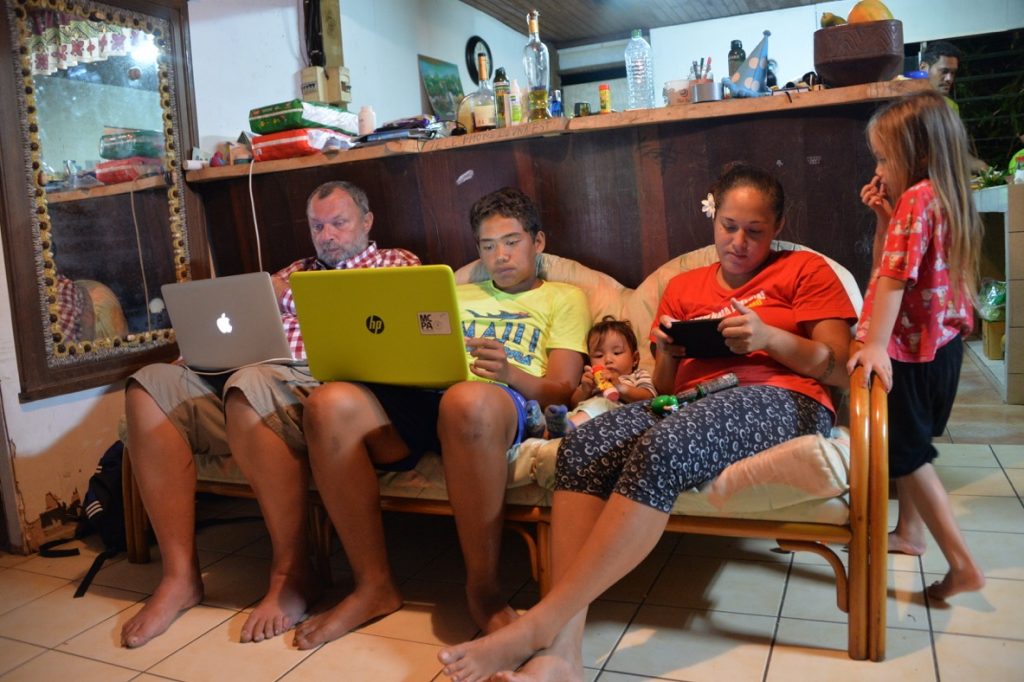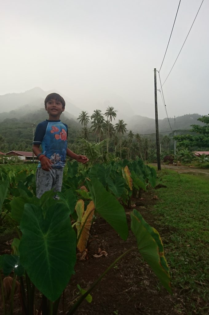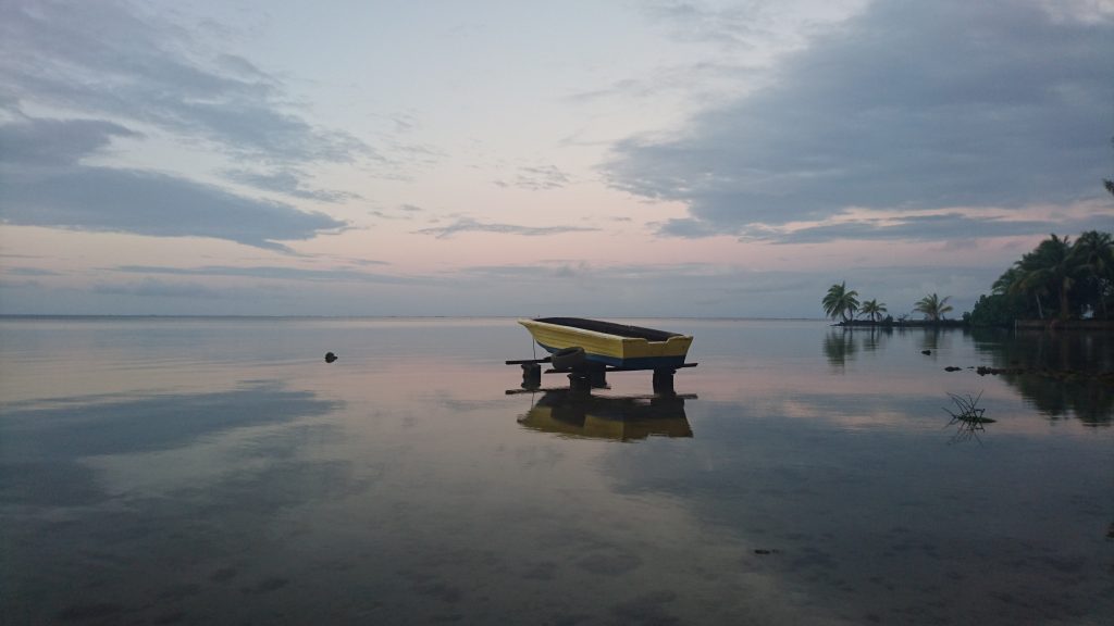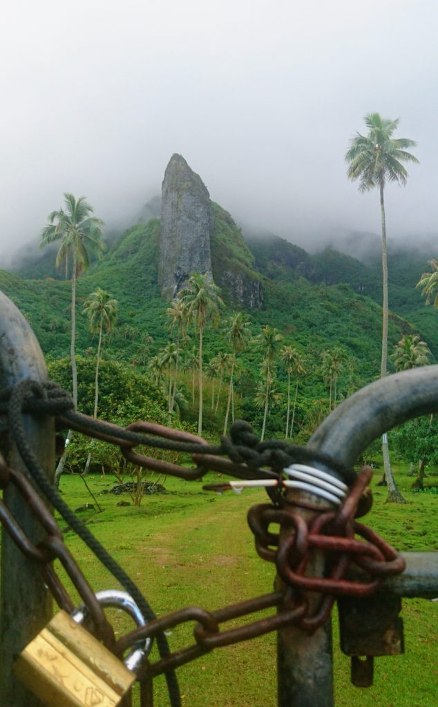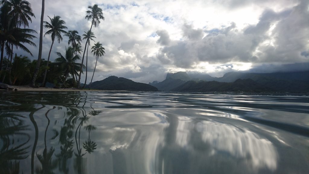 Die nächsten Tage war mehr oder wenig geschäftiges Treiben. Auf jeden Fall war die Bude voll. Leonies Kinder mit Partnern, Enkel und Freunde, ein paar Freundinnen, ich…Jeder Raum war mit Matratzen ausgelegt, die tagsüber hochgeklappt wurden und niemand beklagte sich. In Deutschland wären die Gäste anspruchsvoller. Hier herrschte frohe Ferienlagerstimmung. Den besten Platz aber hatte ich: ein Zelt im Garten. Ganz für mich allein und abseits der Dauerberieselung von Smartphones, Tablets und Laptops. Ich merke, dass ich alt werde wenn ich auch schon zu den Leuten gehöre, die sagen früher war alles besser. Ich strandete also am Samstag auf Raiatea, Donnerstag war Weddingtime. Leonie hatte alles unter Kontrolle und versicherte uns es gäbe erst Mittwoch Arbeit für uns. Wenn man so um sich schaute, fragte man sich, wie zum Geier alles bis Donnerstag fertig sein sollte, es sah so überhaupt nicht nach Vorbereitungen aus. Und alle lagen entweder am Strand oder vor irgendwelchen Monitoren. Mein Dad zeigte mir die Ostseite der Insel und meine Augen hatten Mühe all die Abundanz zu verarbeiten. So viele Obstbäume, Blumen, ein üppiger Regenwald. Schöne Bergformationen, die keinen Tag gleich aussahen, weil die Nebelschwaden alles umspielten. Auf der anderen Seite das Meer, spiegelglatt.