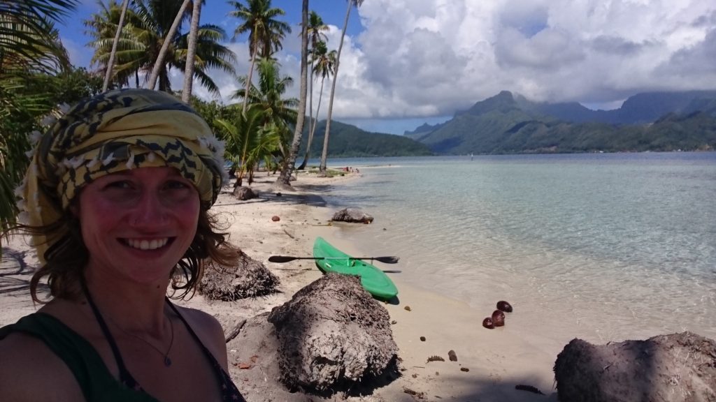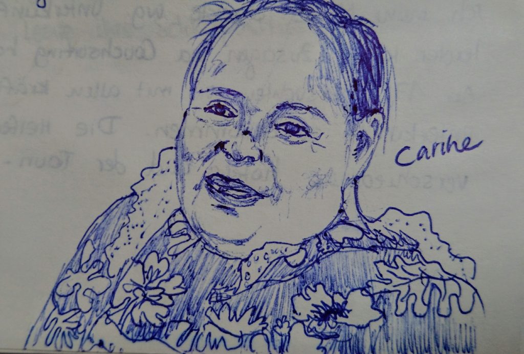 Am Abend genieße ich leckeres Abendessen bei Noëline daheim und lerne wie man hier in Französisch Polynesien rohen Fisch zubereitet. Es schmeckt köstlich, so gar nicht nach Fisch hehe. Zuvor hatte ich noch die Ehre mit einer Tahitianischen Rudergruppe ein Hoe-Training mit zu machen. Das ist schon ne ganz andere Liga als meine Rapa Nui -Truppe, die keine Gelegenheit auslässt, um ein Bierchen trinken zu gehen. Am nächsten Morgen schlage ich meine Wartezeit bis zur Treffstunde an der Touri-Info herum und lerne Carine kennen. Sie hat dort einen Souvenirstand und beantwortet geduldig all meine Fragen zum typischen Leben eines Tahitianers. Tahiti ist eigentlich nur der Name einer Insel. Dort ist auch die Hauptstadt. Das Land heißt genau genommen Französisch Polynesien und besteht aus mehreren Inselgruppierungen: die Gesellschaftsinseln (zu denen auch all die anderen Insel gehören, die ich in den kommenden Wochen betreten werde), die wilden Marquesas, die Tuamotus, die Austral Inseln und die Gambiers. Jede dieser Inselgruppen besteht ihrerseits aus einer Vielzahl von Inseln oder Atollen. Wie auch Carine, kommen einige Tahitianer von den weit entfernten Archipelen, um hier besseres Geld zu verdienen. Aber Carine sagt, eigentlich geht es uns nicht schlecht. Selbst wenn man nicht viel verdient, kann man hier überleben. Wir haben fast alle ein Haus mit Grundstück. Dort haben wir Kokos, Bananen, Papayas, und fischen gehen kann auch jeder. Sie sagt man verdiene so im Mittel 1300 Euro, in den Supermärkten ist das schnell weg. Aber wenn man kein Geld für Miete zahle, wäre es alles gar nicht so schlimm.