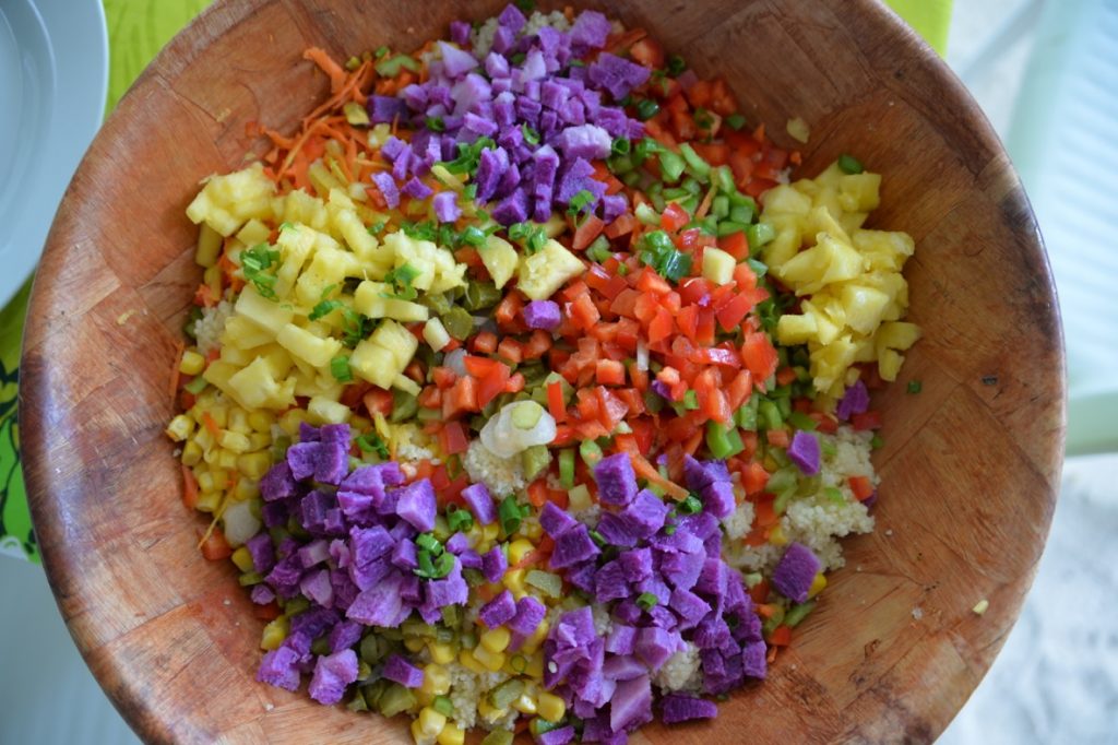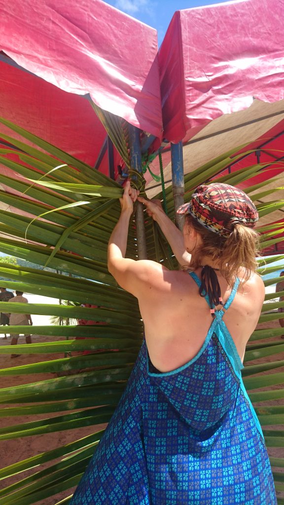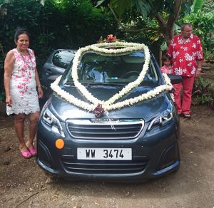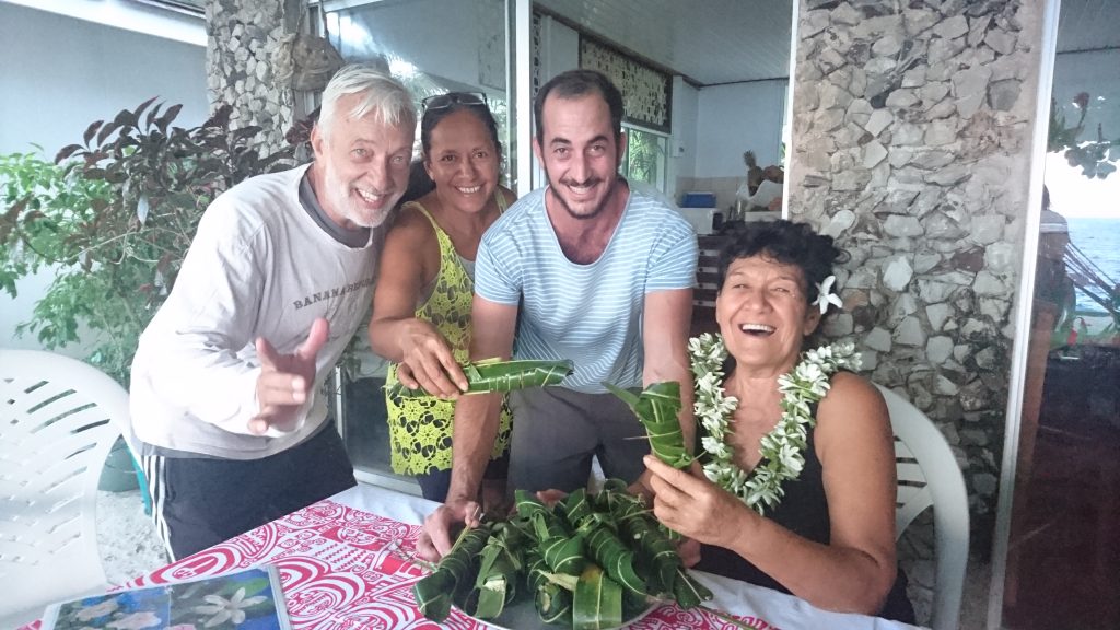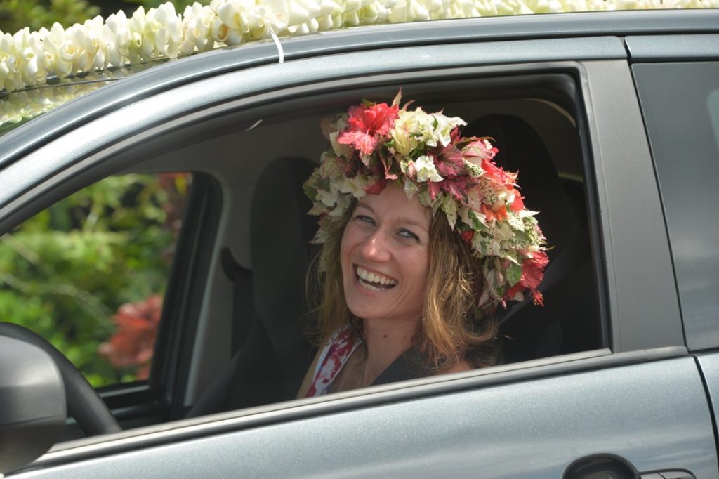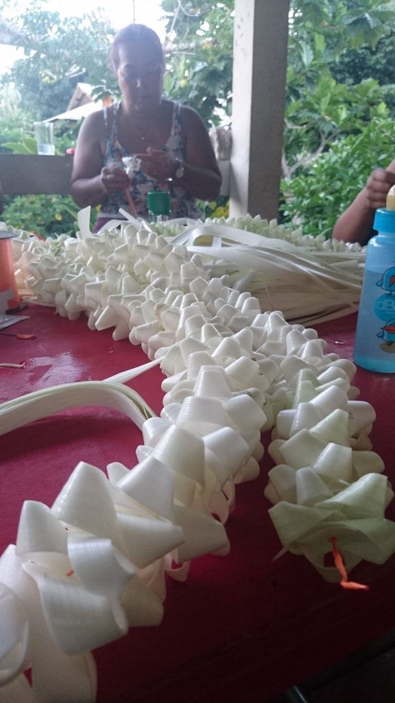 Wir stellten Stühle und Tische auf und dekorierten mit Palmwedeln und Blattgirlanden. Parallel kochte in der Schulkantine Leonies „Kochteam“ ein polynesisches Festmahl. Hatten wir uns vorher gewundert darüber, dass man von den Vorbereitungen nichts mitbekam, lag das daran, dass Leonies Kirchengemeinde das meiste davon „heimlich“ unter ihrer Anleitung erledigte. Viele ihrer Gemeindeschwestern und Brüder stellten zum Teil kostenlos Lebensmittel von ihren Plantagen zur Verfügung: Taro, Maniok, Bananen, Kürbisse, Thunfisch, Kokosnüsse etc. Sie kochten und werkelten die ganze Nacht durch, während wir bis in die Morgenstunden Blumenketten und Kronen , sowie die Deko vom Hochzeitsauto bastelten. Ich lernte wie man aus Blättern Rosenblüten faltet, aus Blüten und Blättern Kronen pflicht und aus Palmstängeln Girlanden zwirbelt. Das machte Spaß.