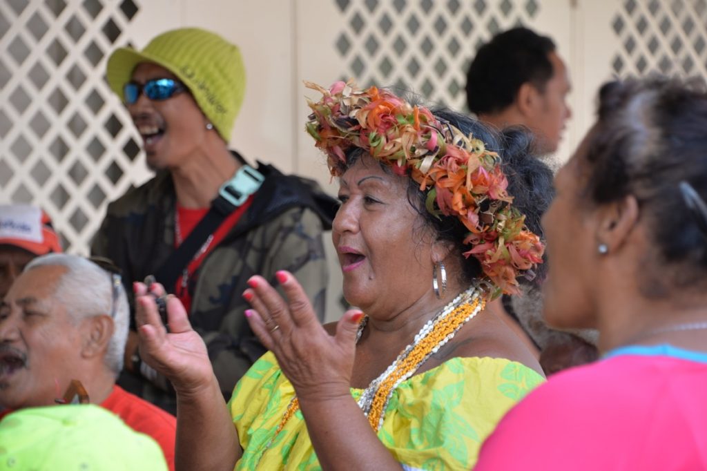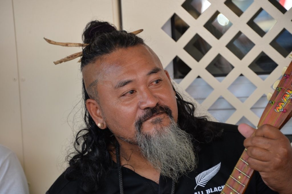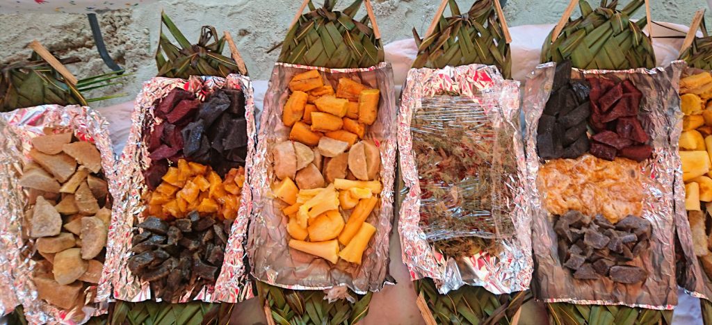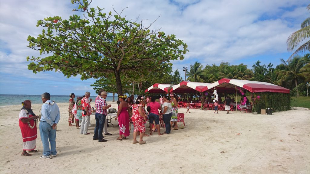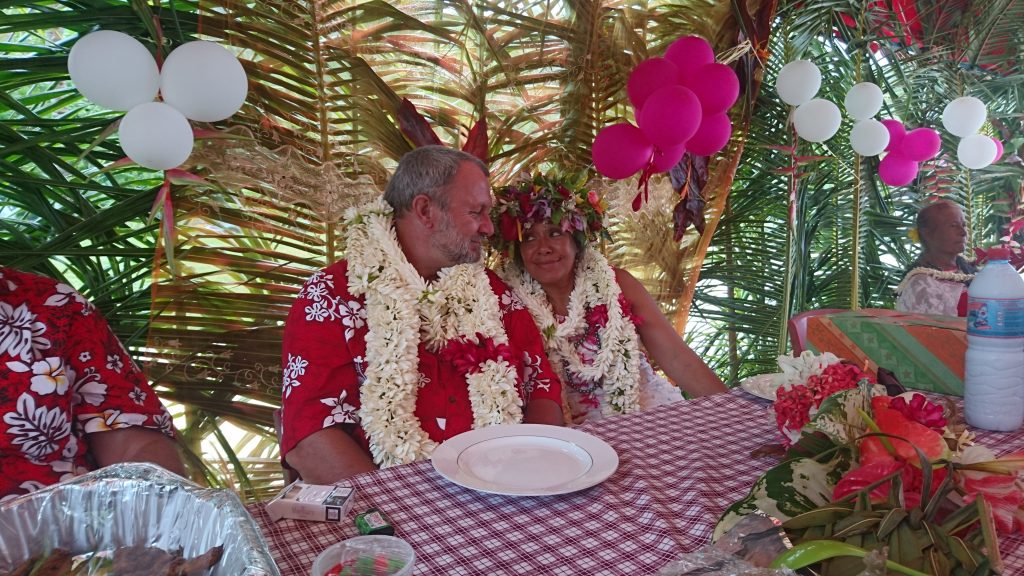 Anschließend machte Dietmar, unser Hochzeitsfotograf und Freund meines Vaters, noch einige Gruppenbilder, ehe wir im Hupkonvoi unüberhörbar zum Festzelt am Strand fuhren. Das machte im Grunde wenig Sinn, weil eh fast alle Dorfbewohner sowieso auf der Hochzeit waren, hahaha, aber hat Spaß gemacht. Das Festgelände war ein Anblick! Ein schöner, gebogener Sandstrand, in der Mitte ein Baum mit einem kleinen Empfangsbüffet darunter, seitlich einige Kokospalmen und hinter dem rot-weiß-gestreiften Festzelt die im Schatten riesiger Bamyanbäume verborgenen Umrisse des Weltkulturerbes „Tapu-tapu-atea“ (das doppelte TAPU verdeutlicht, wie EXTREM heilig und unantastbar dieser Kultplatz ist). Es trudelten nun auch noch mehr Gäste ein und nun waren wohl an die 150-170 Leute da. Die Kinder spielten am Strand und badeten, die Erwachsenen saßen um das Büffet herum. Der Pfarrer von Leonies Gemeinde hielt eine Rede auf Tahitianisch und nach dem Gebet wurde das Büffet eröffnet, das farbenfroh und schön in Palmwedelschalen angerichtet in der Mitte des Zeltes darauf wartete verschlungen zu werden. Es gab Lammcurry, Huhn, Fisch, teils gegrillt, teils roh, verschiedene traditionelle Beilagen wie „Poe“ in verschiedenen Varianten. Das ist eine Art fester Pudding bzw. Kuchen , der aus unterschiedlichen Gemüsesorten gebacken wird. Aus Taro, aus Maniok, aus Banane, aus Kürbis. Die Konsistenz ist schwer zu beschreiben, so eine Mischung aus Schlauchboot und Rührkuchen. Aber schmackhaft!