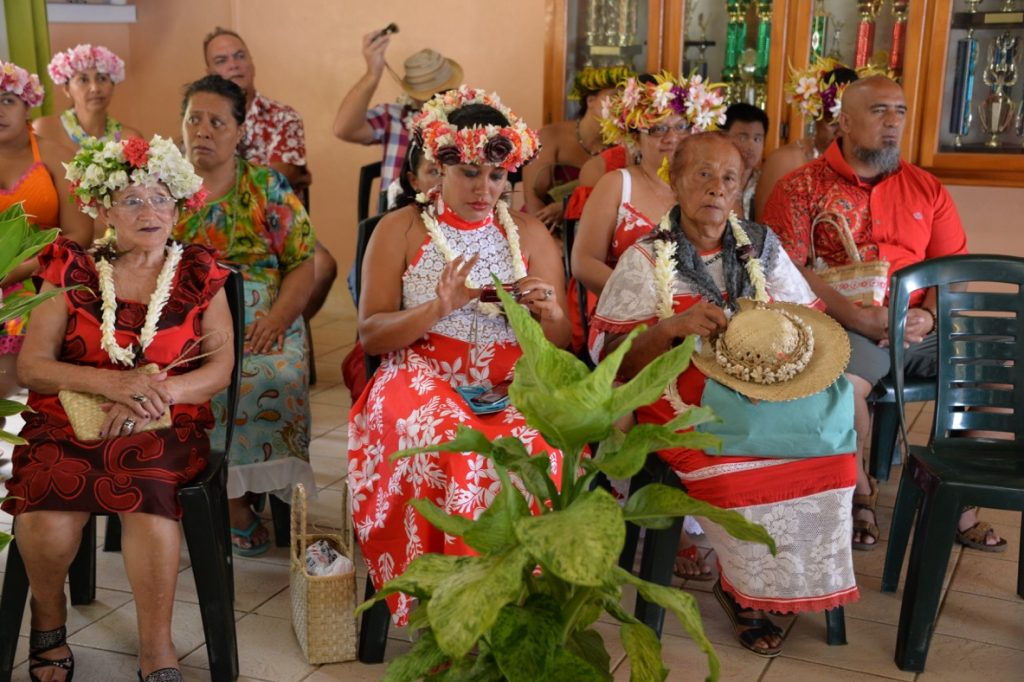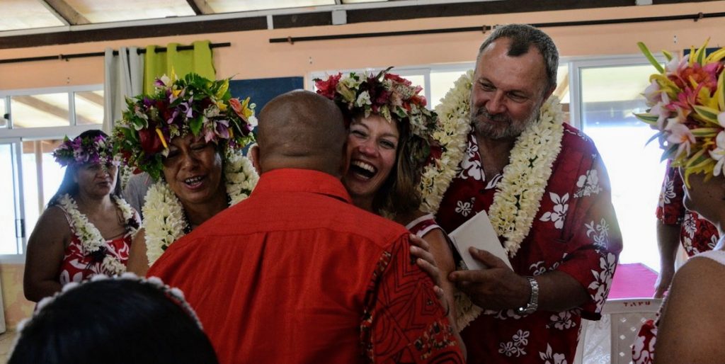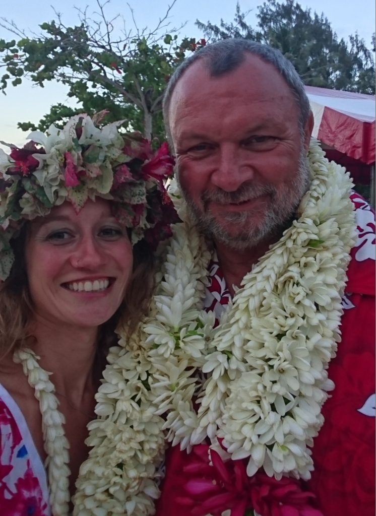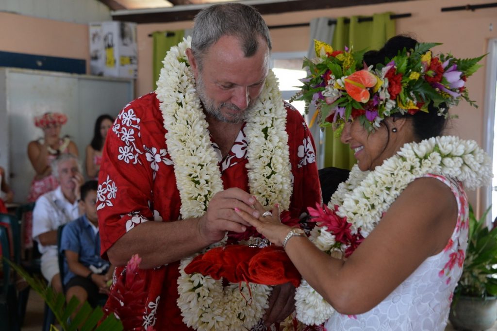 Die Zeremonie war auf Französisch und bestand im Wesentlichen aus den Gesetzesparagrafen und ein paar Worten zum Paar, der Ehre, dass wir an so einem bedeutenden Ort der Polynesischen Kultur feiern würden und dem Überreichen des Familienbuches, wo Platz für mindestens noch acht neue Kinder drin war. Dann kam das Ja-Sagen, beziehungsweise „Oui“-Sagen und zunächst war Leonie dran und dann mein Vater, der dreimal „oui“ sagen musste, ehe es deutlich genug war, weil er sich räuspern musste und nur ein komisches Gurgeln zu verlauten war, schmunzel schmunzel. Ach wie schön, jetzt ist er unter der Haube! Ich habe mich echt für die Zwei gefreut, es war ein schöner Moment.