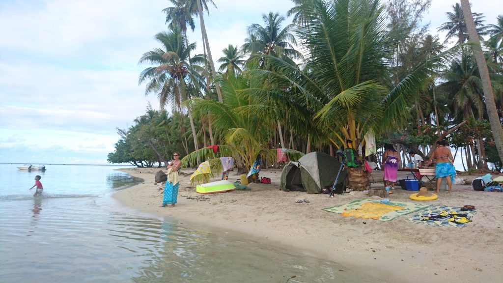 Doch mit der Trauung war die Feierei noch nicht zu Ende. Und das Schönste an der ganzen Hochzeit war ja aus meiner Sicht sowieso die Tatsache, dass die Familie und engsten Freunde über einen längeren Zeitraum vor und nach der Trauung beisammen waren und so eine Art Familienurlaub gemacht haben. Das hat doch die ganze Veranstaltung sehr gelockert und gelassene Ferienstimmung aufgebracht. Zwei Tage nach der Trauung wurde Leonie in ihrer Kirche abermals getauft und anschließend verbrachten wir etwa zu zehnt ein Wochenende auf einem „Motu“. Motus sind kleine Riffinseln, die den Hauptinseln vorgelagert sind und dieses war ausgestattet mit öffentlichen Toiletten, Sitzbänken, Schutzdächern etc. wo wir umsonst grillen und zelten konnten – und das in spektakulärer Landschaft. Wir gingen schnorcheln, paddeln, die Jungs gingen Harpunieren und Fischen, die Mädels sonnten sich, baden, schlafen….