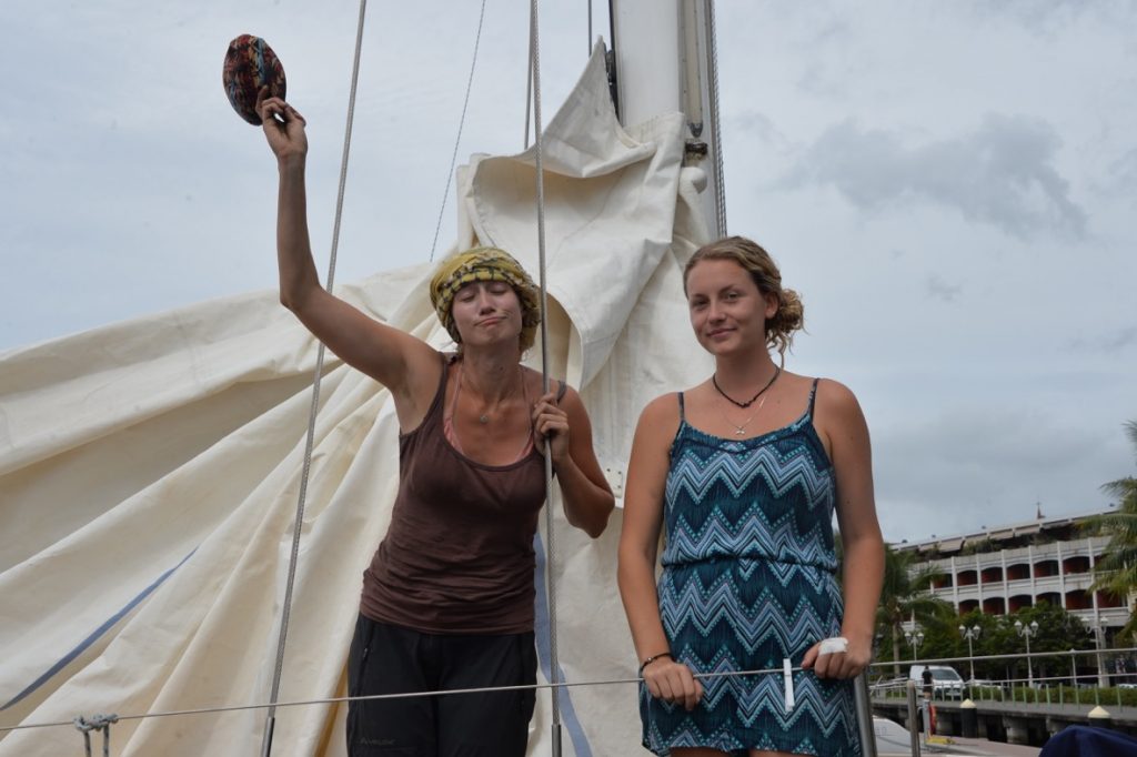 Schon über WhatsApp war mir der Kontakt mit der Manihiki sympathisch. April, wie der Monat, war meine philippinische Ansprechpartnerin und empfing mich am Steg als ich in die Marina kam. Sie war klein, sehr schmal, dunkelhäutig, und ausgesprochen hübsch. Haare bis über den Po. Pokahontas. Sie lächelte und ihre weißen Zähne und das Weiß in ihren dunklen Augen blitzten mich freundlich aus ihrem Puppengesicht an. Ein paar Meter weiter arbeiteten drei Männer auf dem Steg an einem Aluprofil. Es war schon später Nachmittag und sie sahen aus, als hätten sie schon länger dort gewerkelt. Umständliches ich-will-dich-nicht-schmutzig-machen Händeschütteln mit Adrien, Gucho und Paolo. Wer war jetzt Paolo? Der?! Der sieht gar nicht aus wie ein Italiener! Hellblaue Augen, rotblondes langes Lockenhaar. Aber kaum machte er den Mund auf, war er eindeutig ein Italiener. Grins. Gucho sah aus wie eine Hyäne. Ich sah, dass die Jungs beschäftigt waren und April führte mich zum Boot. Es kam mir riiieesig vor. Es war gefühlt doppelt so lang wie die Coccinelle. Wir zogen die Schuhe aus und stiegen aufs Deck – ein großes, weites Teakdeck. Viel Platz und eeeewig lang. Ganz vorn an der Spitze so eine Holznadel, die, wie bei den Piratenbooten von früher, den Rumpf verlängert, um noch ein Segel zu befestigen, darunter ein Netz, perfekt als Hängematte zum Sternegucken. Überhaupt hatte dieses Boot Stil. Es war ein Holzboot. Es sah alt aus, hatte Charakter und Geschichte. Baujahr 1932. Eine junge Blondine kam aus den Tiefen empor und stellte sich lächelnd vor. Natalie. Sie zeigte auf meine Nase und sagte: cooles Piercing. Ich zeigte auf die ihre und sagte. Deins auch und lachte. Wir setzten uns zu dritt an Deck und quatschten, erzählten ein wenig über uns und über die Pläne. Ich stellte ein paar Fragen zu Kosten und Zeitplan und April erklärte mir, was sie wusste. Doch eins stellte sie sofort klar: Paolo ist der Kapitän und was der Kapitän befiehlt, wird weder hinterfragt noch anders gemacht. Vor allem unterwegs. Manchmal müsse es eben schnell gehen, da ist für Demokratie kein Platz. Hilfe.