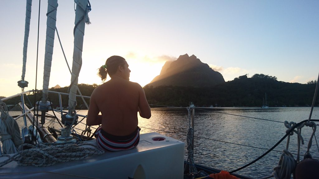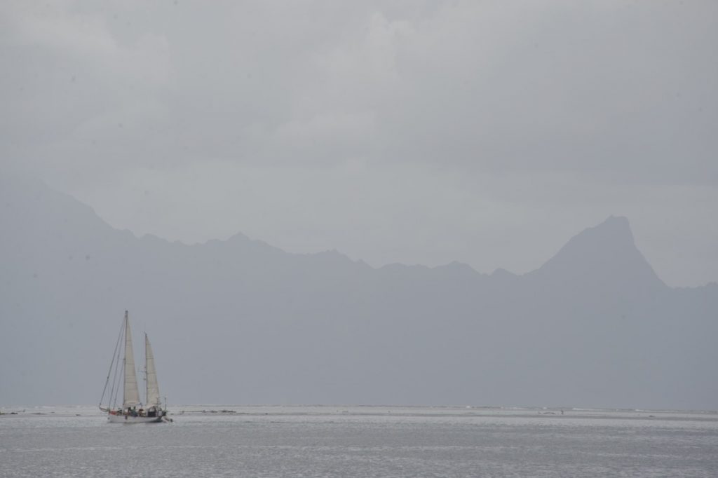 Am sechsten Tag – endlich Abfahrt! Aber was für eine! Völlig übereilt und unvorbereitet mit noch chaotischem Deck, überall Werkzeug, unaufgeräumtes Durcheinander einmal übers ganze Boot verteilt. Und all die Hektik wegen zwei Paddelbrettern, die Paolo in der nächsten Bucht kaufen will. Bei der Überfahrt nach Moorea bockige See, mir ist leicht übel, Nats muss kotzen. Der Baum vom Hauptsegel löst sich bei einer Windböe und fliegt unbefestigt herum. Gut, dass kein Kopf im Weg war. Da war wohl ein Knoten geplatzt. Wir sehen in der Ferne Wale…Das war unsere erste Segelfahrt mit der Manihiki!!! Wir sind unterwegs!