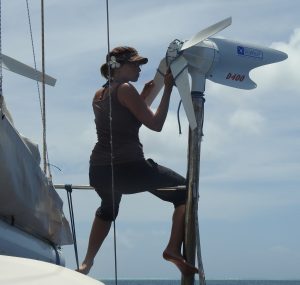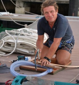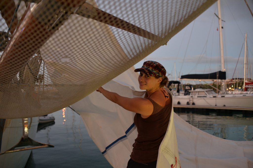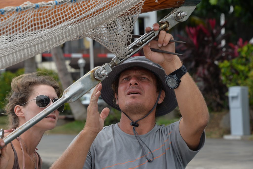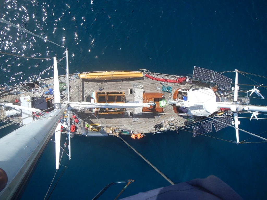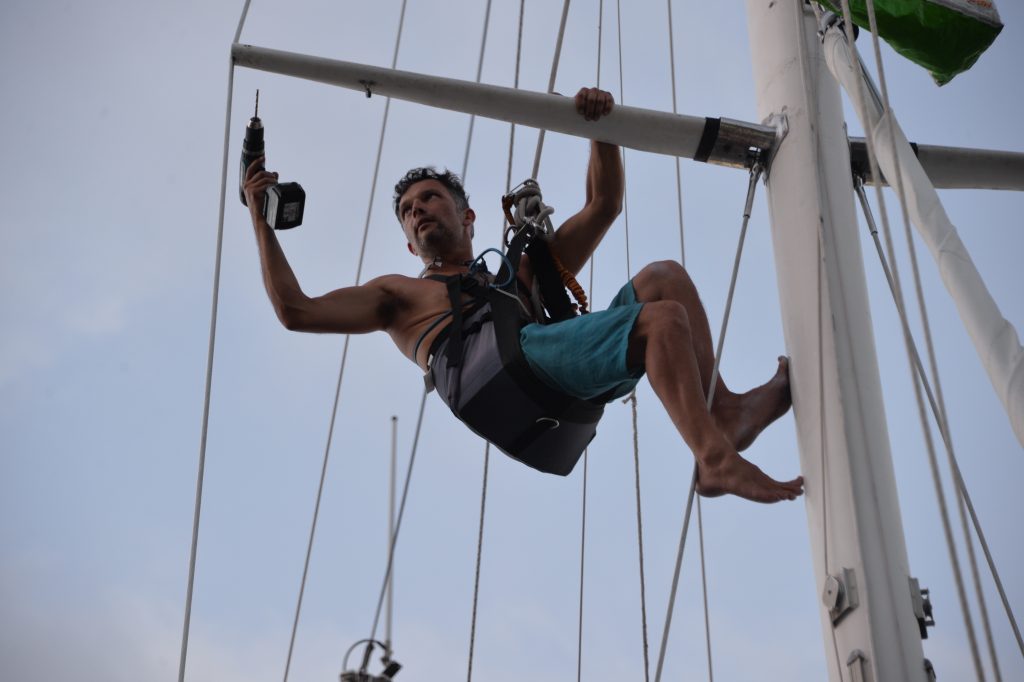 Das Stahlseil (Ich erspare euch das Fachchinesisch, dazu ein separater Abschnitt), an dem dieses immense Segel hängt, war völlig zerstört, zusammen mit dem ganzen Zubehör. Weitere 4 Stahlseile, die die beiden Masten abspannen, mussten ausgetauscht werden, die Motorkühlung hatte einen gigantischen Riss, weshalb der Motor nicht einsatzfähig war, die Salzwasserleitungen zu den Klos hatten auch ein Leck, im Rumpf befanden sich ganze drei Pumpen, um das Wasser jederzeit abzupumpen. Die Liste war schier unendlich. Und mit jeder Reparatur fielen neue Aufgaben an, es musste ständig improvisiert werden und Paolo und der „Kapitän in Ausbildung“ Adrien, fuhren jeden Tag durch die Stadt auf der Suche nach geeigneten Werkstätten und Baumärkten für die Ersatzteile. Für mich war es das Paradies. Werkeln, Lernen, Neues.