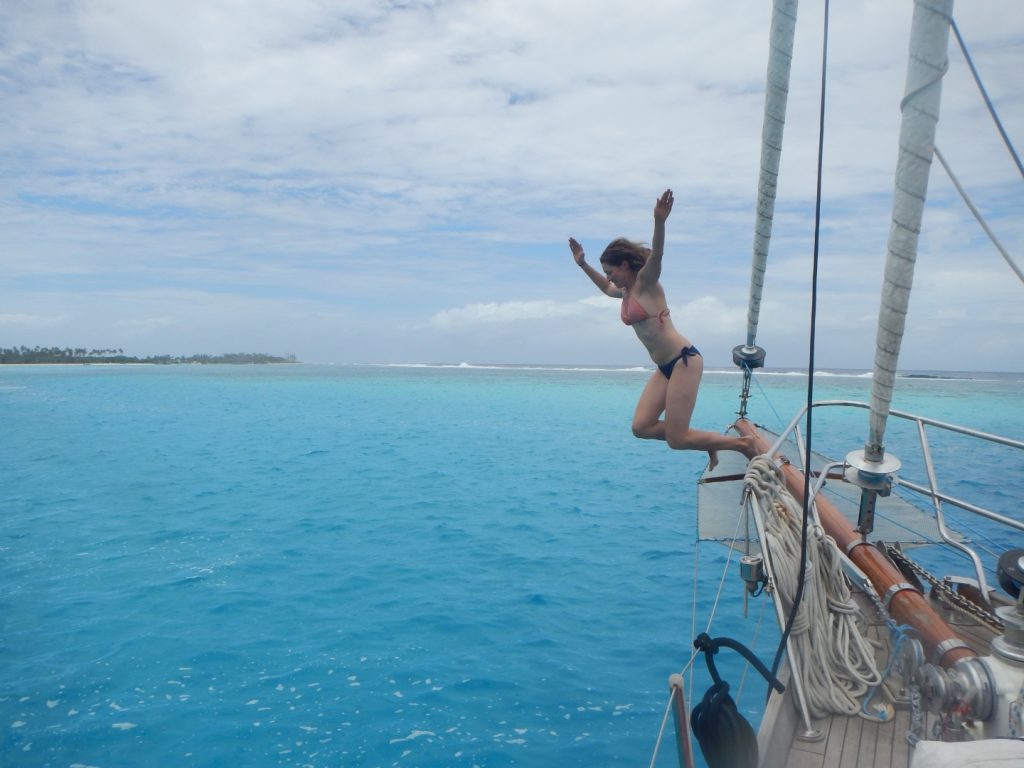 Vierte Nacht auf „hoher See“, ohne Wind. Wir sind sogar baden gegangen. Wir konnten nur am ersten Tag ohne Motor segeln. Einziges Land war das Atoll Motu One, das wir auf der Nordost Seite passierten. Vier Tage ohne Land in Sicht und manche von meinen Kollegen sind schon gelangweilt. Wenns nach mir ginge, könnte ich noch mehr Ruhe und Einsamkeit vertragen. Ich hätte echt mal Lust auf nen ganzen Monat allein auf See. Der (schwache) Wind hat die Richtung gewechselt und bringt uns zu weit nördlich. Ohne Rückmeldung vom Suwwarow Atoll, dass wir ohne Genehmigung nicht ansteuern dürfen, haben wir nun beschlossen weiter nördlich Manihiki anzusteuern, dass namensgebend für unser Boot war, als es 1932 in Frankreich gebaut wurde. Für die Nächte sind wir nun in Zweierteams zur Nachwache eingeteilt. Die Schicht dauert je zwei Stunden und Paolo vereint die Teams so, dass stets einer mit etwas Erfahrung dabei ist. Ich und Gucho bilden ein Team, glücklicherweise! Gucho mit Nathalie – das hätte Mord und Totschlag gegeben. Er kann sie nicht ausstehen. Die Nachtschichten sind meine Lieblingszeit an Bord der Manihiki. Es ist endlich Ruhe (bis auf den Rund um die Uhr lärmenden Motor, grummel) und der Sternenhimmel ist ein niemals langweilig werdender Riesenbildschirm. Hin und wieder eine Sternschnuppe, das Rauschen der Wellen, dass man jetzt viel besser wahrnimmt, wo weniger Menschen wach sind. Hin und wieder im Flüsterton gehaltene Gespräche über die Welt und die Gesellschaft mit Gucho, während im Cockpit Paolo und April pennen. An manchen Abenden gibt es auch richtig Aktion in den Nachtschichten. Der Wind wechselt, dann müssen die Segel im Dunkeln umgesetzt werden. Oder Regenböen mit Starkwind, dann wieder Flauten. Wir müssen immer wieder den Kurs anpassen und mit Sorge stelle ich fest, dass unsere Route nicht gerade in meinem Sinne verläuft. Wir fallen zu weit nach Norden ab. Jeden Abend sitze ich in meiner Schicht und sende bei jeder Sternschnuppe meinen Wunsch ins Universum, dass ich doch noch nach Samoa komme.