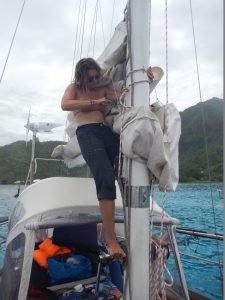 Ab jetzt gab es jeden Tag eine kleine, mittlere, oder größere Katastrophe. Angeblich „muss“ das so auf Booten…Die Manihiki war ziemlich geschunden in Papeete eingetroffen. Gut, dass ich das volle Ausmaß nicht begriff, wer weiß, ob meine Zuversicht sonst so groß gewesen wäre. Von 5 Segeln waren 4 kaputt. Das Größte war nur noch zu retten, weil es noch relativ neu war.