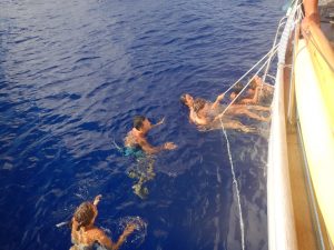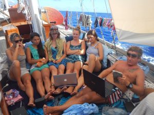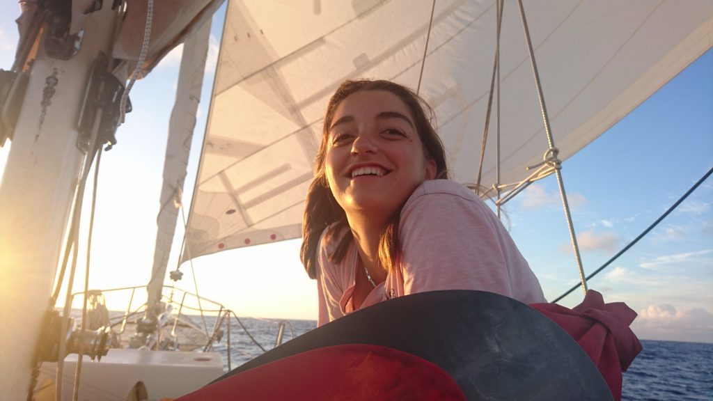 Gio. Die älteste im Team. Eine lustige, junggebliebene Frohnatur aus Italien, die zu jedem Satz ein Lied trällern kann. Sie hat einiges an Segelerfahrung und ist angenehm unkompliziert. Es sagt schon einiges über sie aus, dass sie lediglich mit Handgepäck angereist ist.