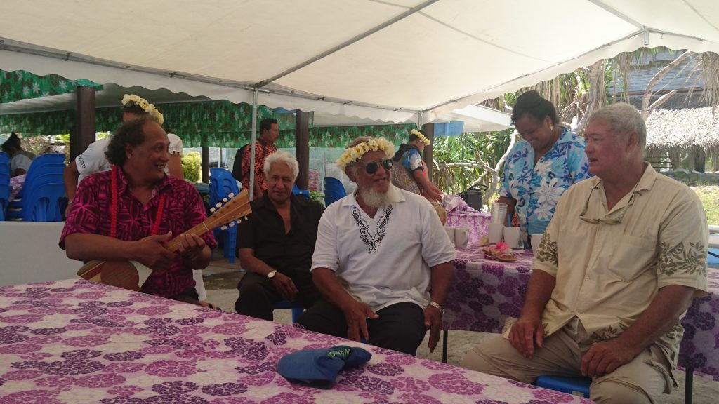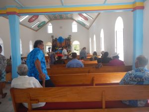 Als der Gottesdienst endet, werden wir von einer kleinen Gruppe Kirchgänger den Weg hochgebracht, zur zweiten Kirche, wo der katholische Gottesdienst im Endspurt steht. Daneben gibt es ein Gemeinschaftshaus für alle Dorfbewohner, wo, wie jeden Sonntag, für das kommunale Mittagessen eine riesige Tafel aufgebaut wird. Dieses Gemeinschaftsmahl findet jeden Sonntag statt, aber heute ist es besonders: nicht nur wegen der weit angereisten Manihikianer, sondern auch unseretwegen. Wir werden als Ehrengäste willkommen geheißen, bekommen jeder eine frische Kokosnuss in die Hand gedrückt und sollen uns zwischen die Menge schmeißen. Das Buffet, zu dem jeder mit einer Speise einen Beitrag leistet, ist einer Hochzeit würdig. Der Wahnsinn! Es wird ein langer Nachmittag in netter Gesellschaft und interessanten Gesprächen mit den Einheimischen, die alle gut Englisch sprechen.