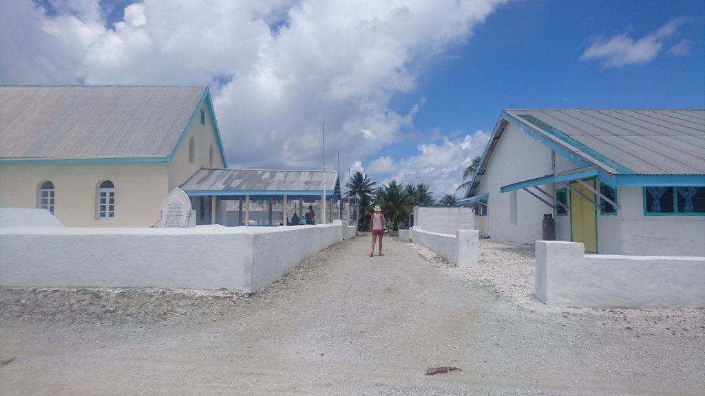 Manihiki. Die Insel. Wir kommen vormittags auf diesem flachen Inselchen an, dass man kaum am Horizont erkennt und gehen an Land. Es ist ein kleines Atoll, von Palmen umsäumt und es gibt kein Dorf, sondern verteilte Häuser, die über eine Schotterstraße verbunden sind. Aber es ist eigenartig. Es ist niemand da. Keine Menschenseele ist zu sehen oder hören, wir laufen Stunden durch die Palmen und sehen außer Hühnern und Schweinen nichts! Als Paolo von den Behörden wiederkommt (die ebenfalls nicht da waren), erfahren wir mehr. Wir sind am nächsten Tag zur Kirche eingeladen. Quasi obligatorisch. Aha. Kirche ist hier wichtig. Die anderen verdrehen schon genervt die Augen, aber meine Erfahrungen aus Tahiti und Rapa Nui haben mir gezeigt, dass ein Kirchenbesuch sich in Polynesien sehr lohnt! Ich freue mich schon und überrede die anderen, dass es wegen der tollen Gesänge ziemlich cool werden wird. Auf Manihiki leben rund 500 Menschen. Das Atoll hat zwei Dörfer und die Leute besuchen sich per Boot indem sie über die Lagune fahren. Dort stehen auch etliche Perlenfarmen, mit denen sich die Menschen hier im wesentlichen ihr Geld verdienen. Wir erfahren auch, dass wir ausgerechnet zu einem besonderen Anlass angereist sind: alle paar Jahre gibt es eine Versammlung aller Manihikianer, zu dem auch alle Familien anreisen, die von der Insel weggezogen sind und nun in Rarotonga (Hauptinsel von Cook Islands), Neuseeland und Übersee leben. Aus diesem Grund war bei unserem Landgang niemand in seinen Häusern.