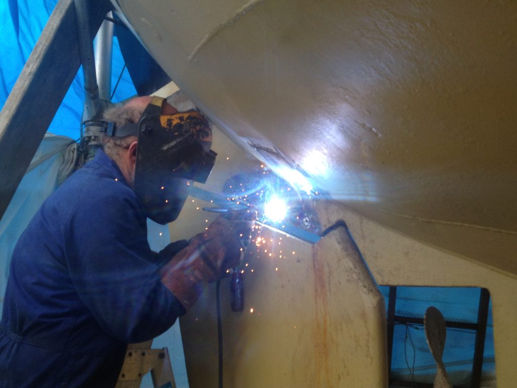 Kevin zeigt mir, was man beim Schweißen an Booten anders macht als sonst.