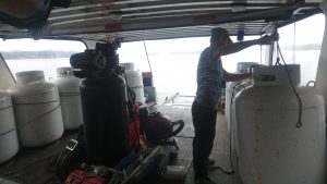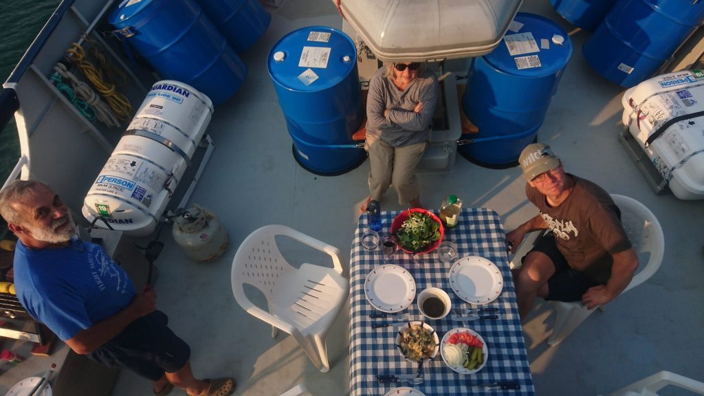Einen Tag vor unserer Abfahrt Richtung Basis – es war Monatsende und Larry hatte noch nichts über unseren Lohn erwähnt – fragten wir nach unserer Bezahlung, die er sonst immer sehr pünktlich vorgenommen hatte und entfachten damit einen epischen Streit, in dessen Verlauf Larry uns sogar vom Boot schmiss und sagte, er wolle uns nie wieder sehen. Uff, so einen Streit habe ich noch nie führen müssen…Boa war ich froh, dass wir zu zweit waren!!! Und boa war ich froh, dass Larrys Tochter Emily und Anne im Nachbarzimmer saßen und alles mitbekamen (auch wenn es mir Leid tat, dass sie ungewollt mit einbezogen wurden).