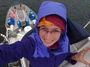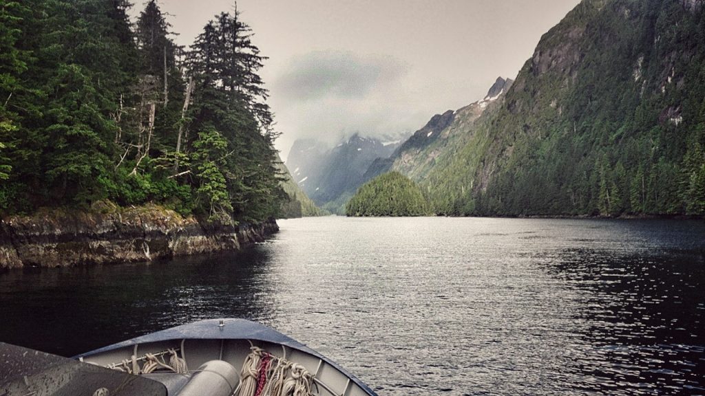 Gegen Mittag machen wir einen Exkurs in eine verlockend aussehende enge Bucht mit steilen Schluchten. Ganz an deren Ende ragt majestätisch ein schneebedeckter Gipfel empor. Mount Ada. Die Bucht ist etwa 5 Meilen lang und da die Schlucht senkrecht aus dem Wasser ragt, können wir mit Scorpius ganz nah an die Felsen heran. Es ist eine tolle Stimmung. Eine Mischung aus Nebel, Sonne, Gewitterwolken, Schneegipfeln und dunkelgrünen Wäldern. Auf dem Rückweg bitte ich Larry ein paar Gänge herunter zu schalten und lasse mein Lachsfang-Gespann herunter. Und als hätte ich es gewusst – kurz vor der Mündung habe ich tatsächlich einen Biss! Larry ist sogleich zur Stelle und bejubelt meinen „Kingsalmon“. 70cm lang, 26 Pfund – mal wieder ein stattliches Exemplar. Wer hätte gedacht, dass ich noch zur Fischersfrau werden würde!