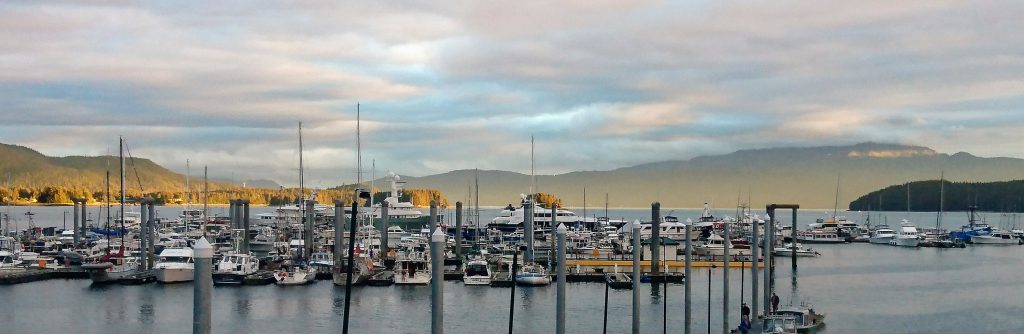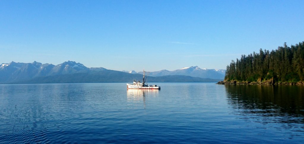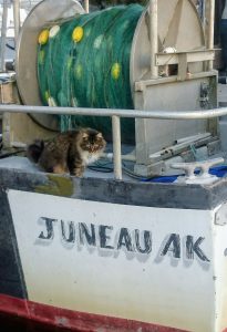 Sitka wird ein kurzes Vergnügen und für Jordy und mich nur eine Ankerplatz-Besichtigung. Wir kommen nicht einmal an Land. Vom Boot aus sieht der Ort ähnlich aus wie Ketchikan: nichtssagende flache Gebäude in die bergige Landschaft gesetzt. Auf manchen Gipfeln Schnee. Im Hafen einige Fischerboote und ein paar private Angelboote. Business as usual.