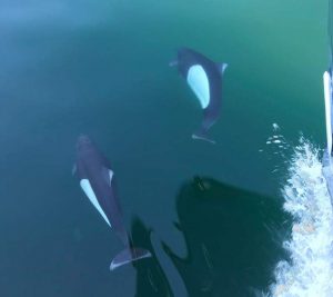 nach Juneau. Also wieder durch den langweiligen Peril Strait und dann Richtung Norden. Gegen 19:00 tauchen am Bug zwei kleine „Doll Puspoises“ auf. Die sehen aus wie zu dicke Delfinbabys und haben eine Schwarz-weiße Musterung. Etwa 20 Minuten lang spielten die Süßen in den Wellen unseres Bugs und drehten sich auf die Seite, um zu uns hinaufzuschauen, wenn Jordy hohe Pfeiftöne produzierte. Herrlich.