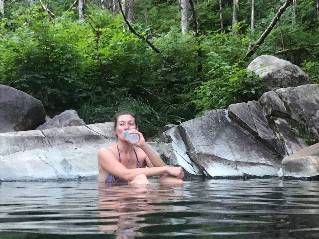 schäumenden Bach im Hintergrund. Allein die Farbe des Baches sagt mir, dass er eiskalt ist. Wir ziehen uns aus und sinken in die Becken. Ich halte den Atem an, so heiß ist das Wasser. Es dauert ein paar Minuten, bis sich meine Haut verbrennen lassen will. Wie kann es sein, dass heiß und kalt so dicht beieinander liegen können? Nach und nach testen wir die verschiedenen Becken ich gehe sogar in eine kleine Wanne mit Wasser aus dem Bach. Brrrr!!! Es war Liebe auf den ersten Blick…Die Becken, die Bäume, der Bach, die faulen Eier und ich….Ich hatte meinen Favoriten dieser Reise gefunden.