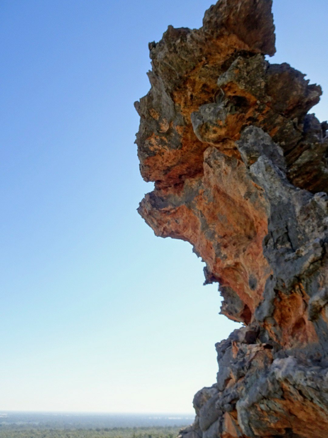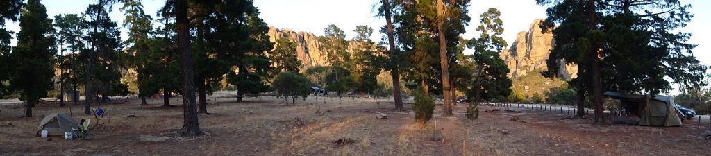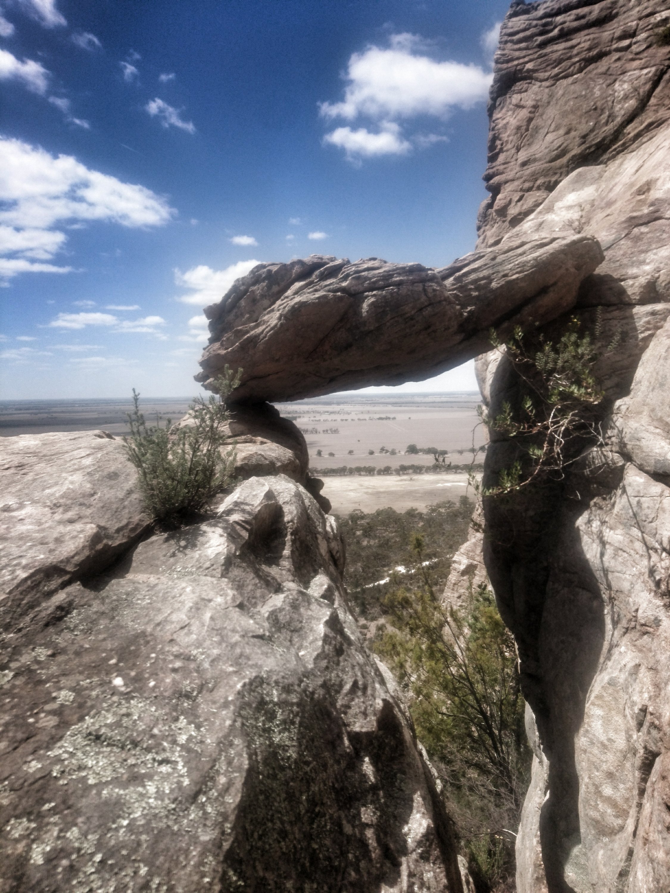 „Dirtbags“. So werden die Kletterer liebevoll in einem Dorf mit dem lustigen Namen Natimuk genannt, dessen Klang mich irgendwie an Pumuckel erinnert, aber wohl einen Aborigine Ursprung hat. Es ist das 550 Seelen Dorf bei Mount Arapiles (Äh-rä-pie-lies), das seit den 60ern ein Mekka für Kletterer aus aller Welt ist. Glücklicherweise haben das Dorf und der Kletterfels null komma null kommerziellen Anschein. Das Dorf ist 10 km vom Klettercamp entfernt, einmal am Tag gibt es einen öffentlichen Bus, der nur hält, wenn man vorher den Fahrer anruft. Im Ort gibt es EIN Hotel, EINE Bank, EINE Apotheke, EIN Pub, EINE Milkbar (das ist der Tante Emma Laden), EINEN gut sortierten Kletterladen und das wars. Ach so ja, ein Pavillion auf der Hauptstraße für die Dorfkapelle und eine Polizgeistation. Beide scheinen unbesetzt zu sein.