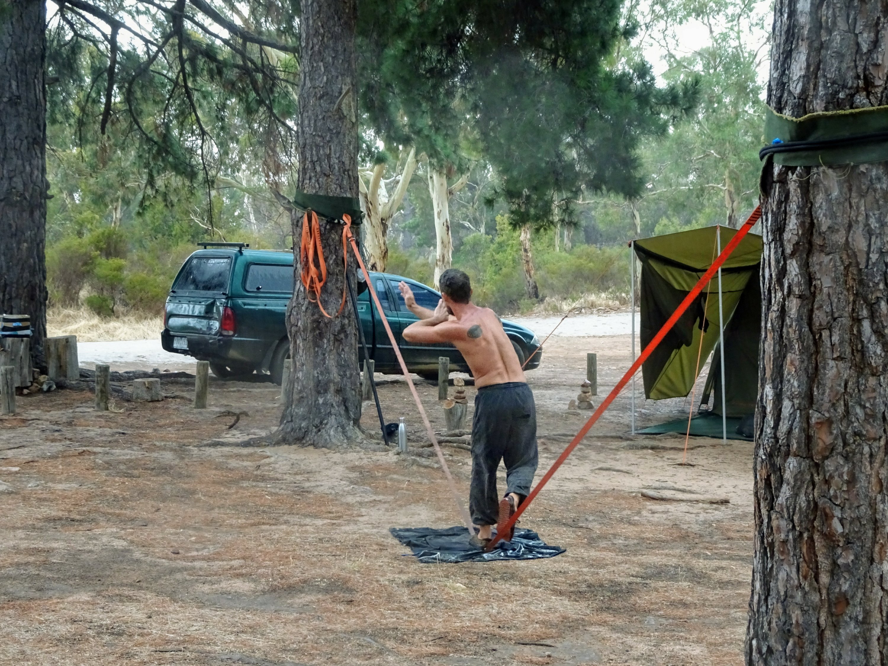 Doch die erste Person, die Casey und ich kennen lernten, spricht ein ziemlich bayrisches Englisch und kommt vom Tegernsee. Georg: Blonder Surferboy läuft ums Camp und fragt die Leute wie man Grünkohl zubereitet. Da kann ich aushelfen. Nach Caseys Abreise wurde Georg mein “Morgen-Buddy” fürs Frühklettern. Bis auf uns Handwerker (er ist Zimmermann) ist das Camp bis 10 Uhr tot, da kommen wir von unserer Morgenrunde zurück und machen ein (zweites) Frühstück. Mit Casey war ich nur einfache und sehr kurze Routen geklettert; die Höchste vielleicht 10 m. Da ich bis auf eine Gelegenheit in Chile keine Erfahrung mit dieser Kletterdisziplin im Freien und ohne Sicherungen hatte, musste ich mich stets nach meinem Partner richten. Für den Anfang war mir das Recht, aber schnell wollte ich mehr. Casey ist Outdoor-Educator, ein großes Ding hier in Australien, um Kindern möglichst oft und aktiv den Zugang zur Natur zu ermöglichen. Er hat ein großes Sortiment an Ausrüstung (und Fakten und Zahlen) für alle möglichen Sportarten in der Natur und er wird in allen ausgebildet, um Kinder ihre Schulfreizeiten zu füllen. Aber was das Klettern betrifft ist er nur dazu ausgebildet ein Seil am oberen Ende der Route zu verankern, damit die Kids hochklettern können und er sie wieder abseilen kann (nennt sich Toprope). Er weiß also unwesentlich mehr als ich, was unsere Kletteroptionen doch erheblich einschränkte.