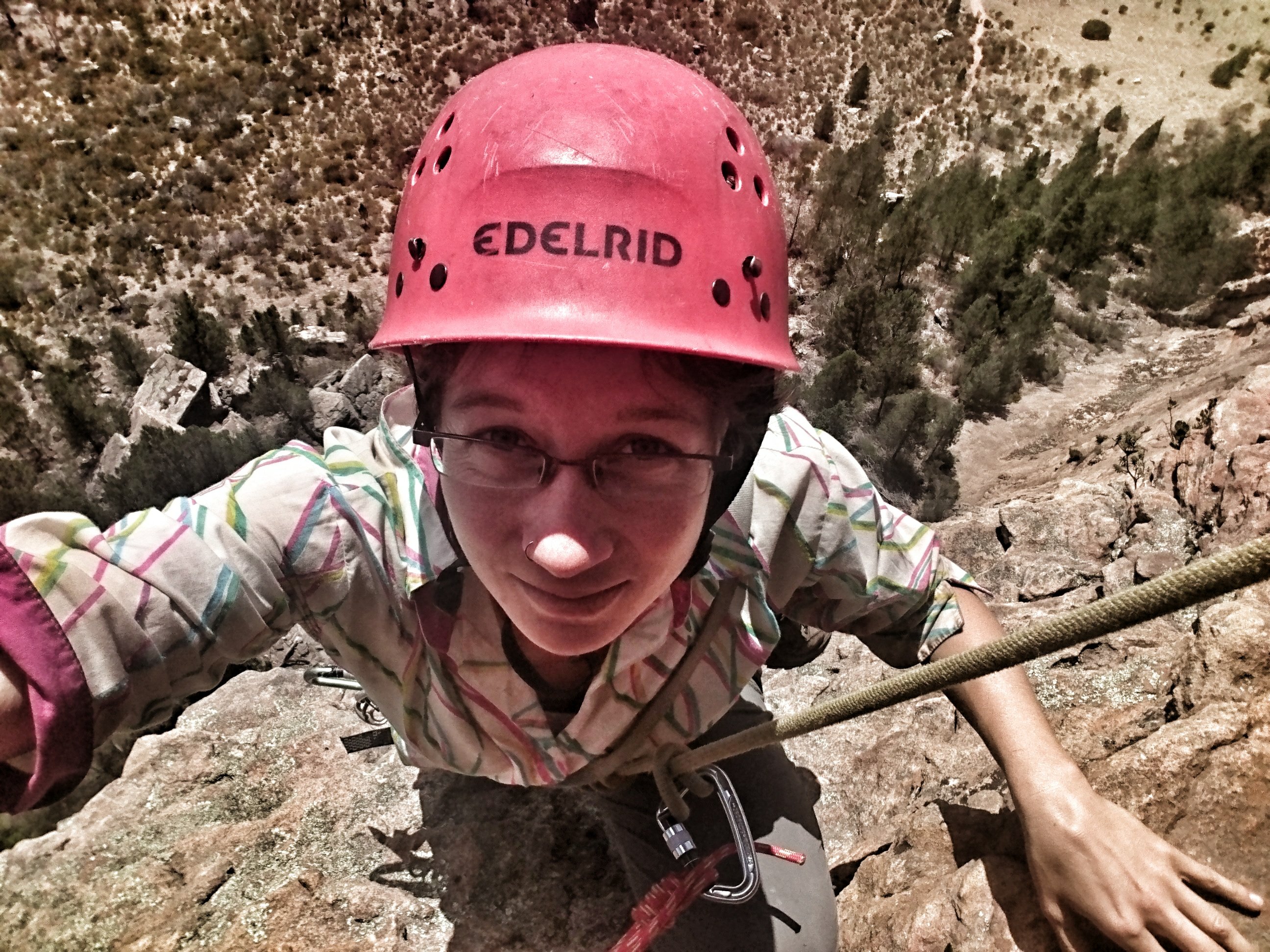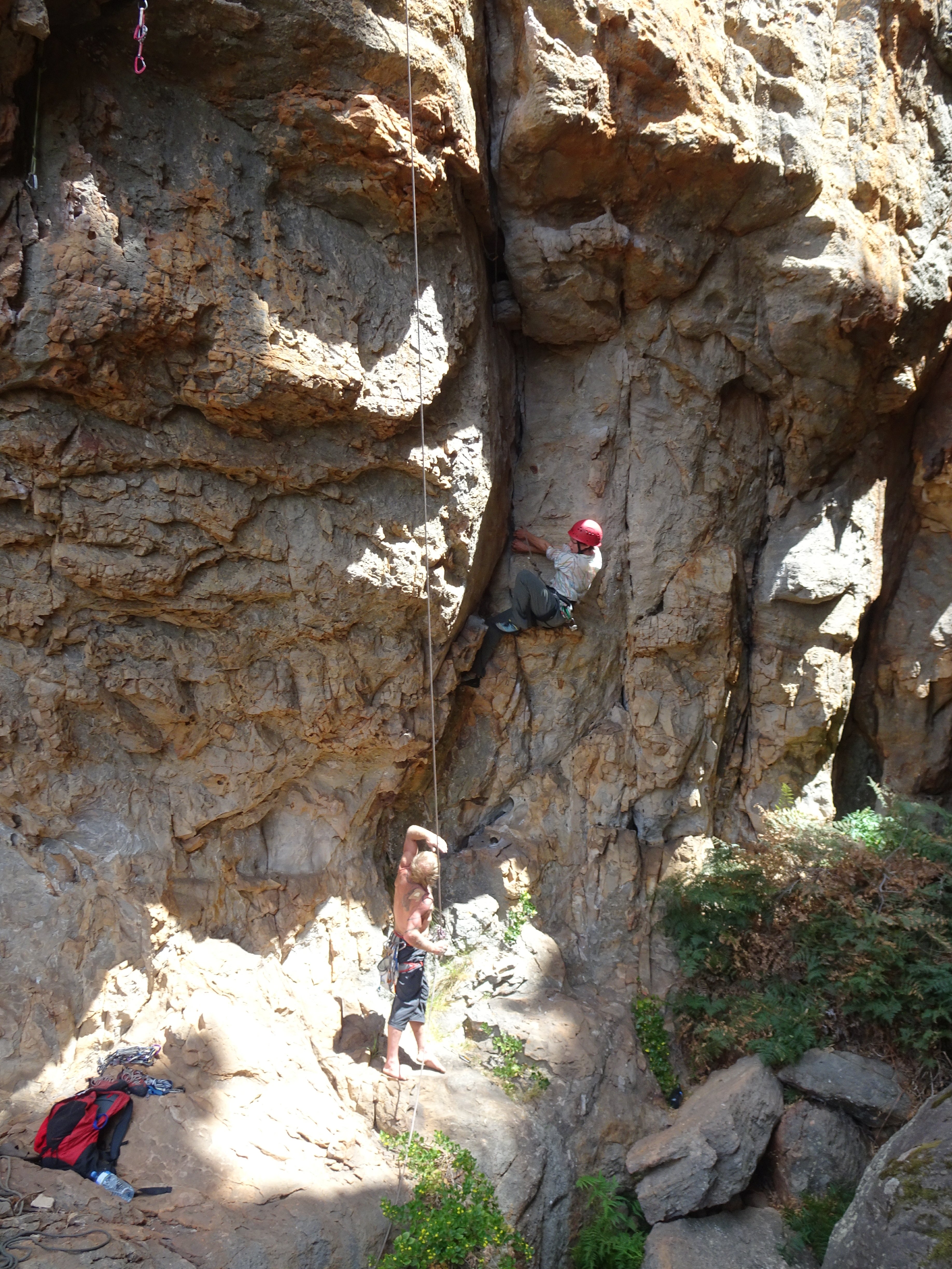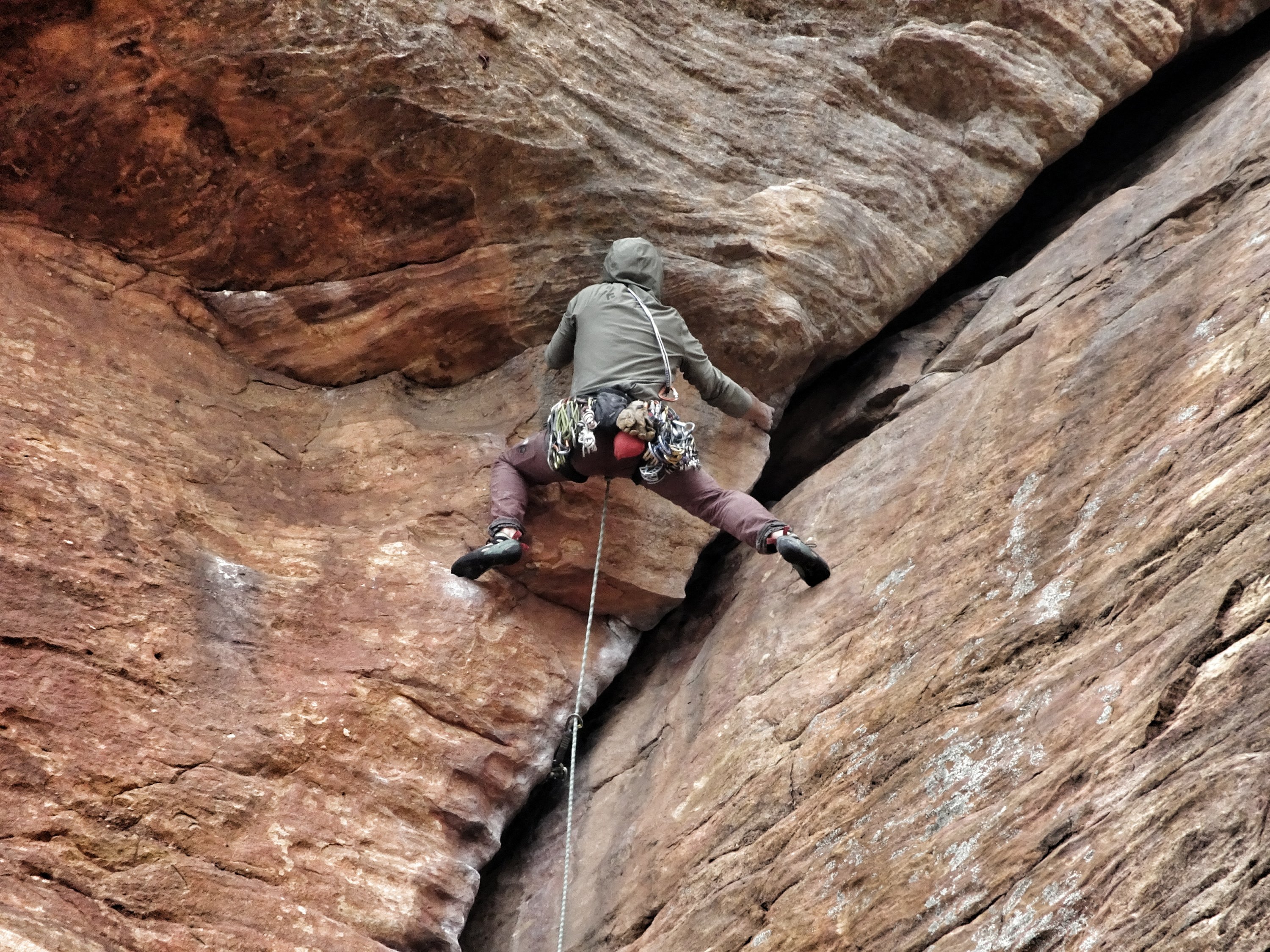 Manchmal muss man im großen Bogen herunter wandern, meistens muss man jedoch nur ein paar Meter gehen, um an zwei Ketten oder Bolzen zu gelangen an denen man sich abseilt. Das Seil wird durchgefädelt, beide Enden heruntergeworfen, man hängt sich ein und seilt sich nacheinander ab. Unten zieht man an einem Ende des Seils und holt das komplette Seil wieder herunter. Drei Stunden später ist die Route also endlich beendet. Hätte man das nicht auch schneller gekonnt? Menno. Trad Climbing erfordert handwerkliches Geschick, Kraft und Ausdauer, Können, ein gutes Auge und Einschätzungsvermögen, Verantwortungsbewusstsein, innere Ruhe und jede Menge mentale Kontrolle. Wie oft klammerte ich mich in den nächsten Wochen winselnd an den Berg und fragte mich warum zum Teufel man sich sowas freiwillig antat! Unter mir die Schlucht von teilweise an die 100 m, über mir der vermeintlich unbezwingbare Fels. Ich kletterte nur Nachstieg, wie entsetzlich musste es für den Vorsteiger sein?! Doch immer wenn ich eine solche Route endlich geschafft hatte, füllte sich meine Brust mit Stolz und einem Gefühl von Kraft. Wieder einmal hatte ich meine (Höhen- und anderen) Ängste überwunden, meine Grenzen überschritten, mir selbst bewiesen, wie stark und schwach der Geist ist. Manchmal schafft man eine Route nicht, dann entdeckt man Wut, Enttäuschung, Selbstzweifel, Angst… Der Fels zeigt uns in den schwierigen Momenten unsere inneren Monster und offenbart Emotionen und Ausdrucksformen, die wir sonst kontrollieren. Manche werden aggressiv und garstig zu ihrem Partner, andere weinen, andere starr und handlungsunfähig. Am Ende vom Tag hat man zu sich selbst und dem Buddy ein engeres Verhältnis.