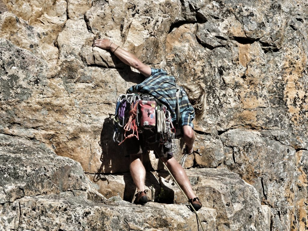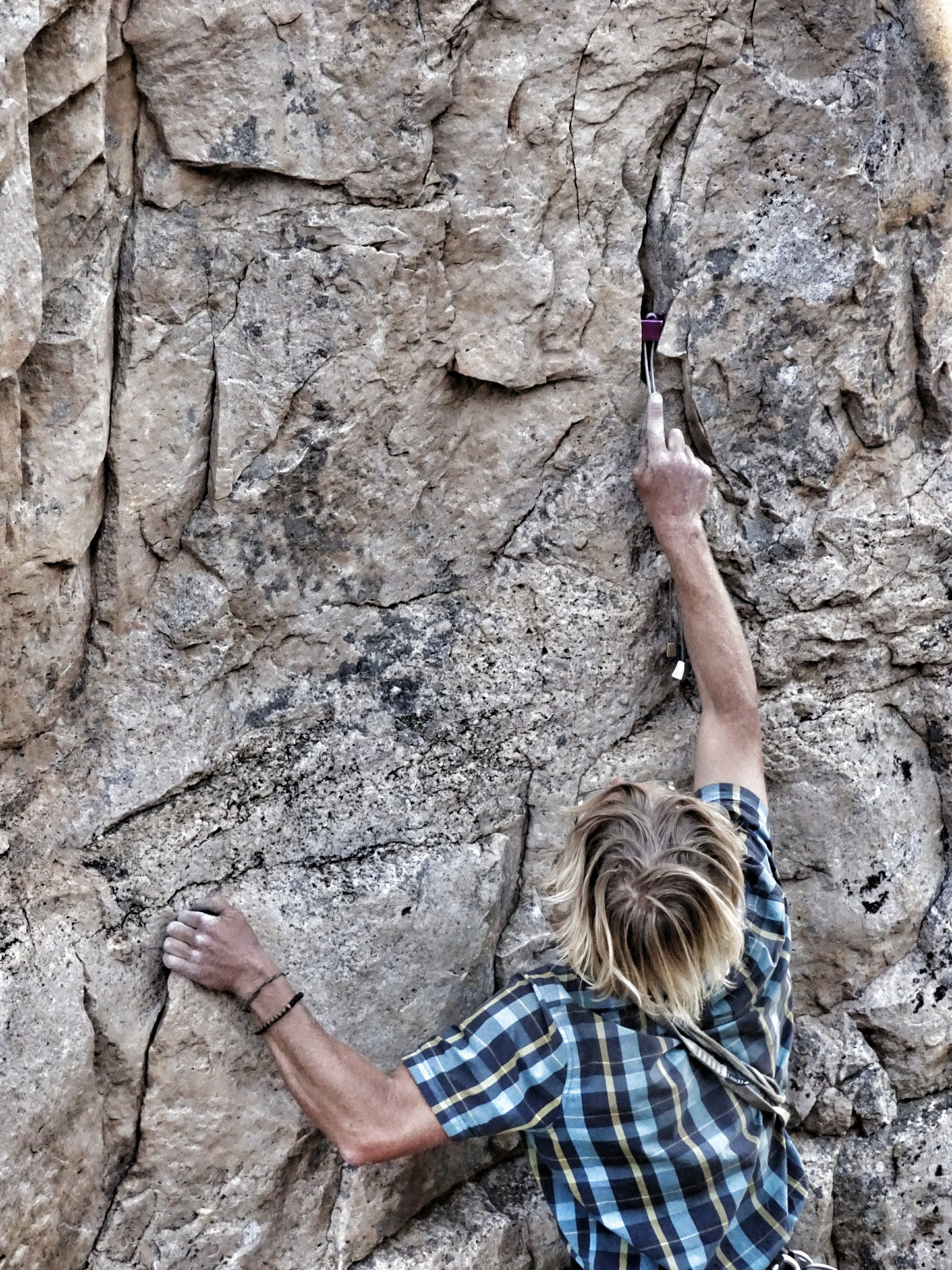Was ich in Deutschland in der Halle geklettert bin, war auch Toprope. Das Seil hängt schon dort, man muss nichts tun außer einer Route folgen und ist jederzeit gesichert. Die Fallhöhe ist quasi Null, vorausgesetzt dein Kletterpartner hält das Seil stets stramm. Die nächst höhere Disziplin ist Sportklettern. Das Seil liegt am Boden, die Route hat jedoch in vorgegeben Abständen Metallhaken mit Karabinern, in die sich der Vorsteiger mit dem Seil einhängt, sobald er sie erreicht. Die Fallhöhe beträgt den doppelten Abstand zum letzten Bolzen, manchmal also etliche Meter. Die Königsdisziplin ist das „Trad-climbing“ (traditionelles Klettern, kurz Trad). Der Fels befindet sich in seiner natürlichen Form ohne Bolzen und Anker. Der Vorsteiger sieht aus wie ein Weihnachtsbaum, an seinem Gurt hängen etwa 5 kg Metall, die er die Wand hochstemmen muss. Der Christbaumschmuck hat diverse Farben und Formen und dient als temporäre Sturzsicherung. Der Vorsteiger muss einschätzen auf welcher Höhe er Sicherungen setzt, wo er sie einfügen kann und welches Teil dort reinpasst. Hat er seine „Nuts, Cams, Offsets, Hexes, Friends etc.“ platziert, wird ein „Quickdraw“ – eine Schlinge mit zwei Karabinern eingehängt und dann das Seil. Je nach Schwierigkeit der Route und Erfahrungsgrad des Vorsteigers kann das eine ganze Weile dauern, bis man oben angekommen ist. Natürlich bestimmt die Möglichkeit Sicherungen platzieren zu können auch die Schwierigkeit der Route. Je weniger Risse und Spalte im Fels vorhanden sind, um den Kletterer vor Stürzen an schwierigen Zügen zu sichern, desto höher der Schwierigkeitsgrad.Der Nachsteiger hat dann die Aufgabe hinterher zu klettern und aufzuräumen. Er muss alle Sicherungen wieder heraushebeln, an den Gurt hängen und je höher er klettert mehr Kilos tragen. Am Ende ist der Fels wieder leer, dann sitzt man zu zweit oben und kommt wie bitte herunter?!