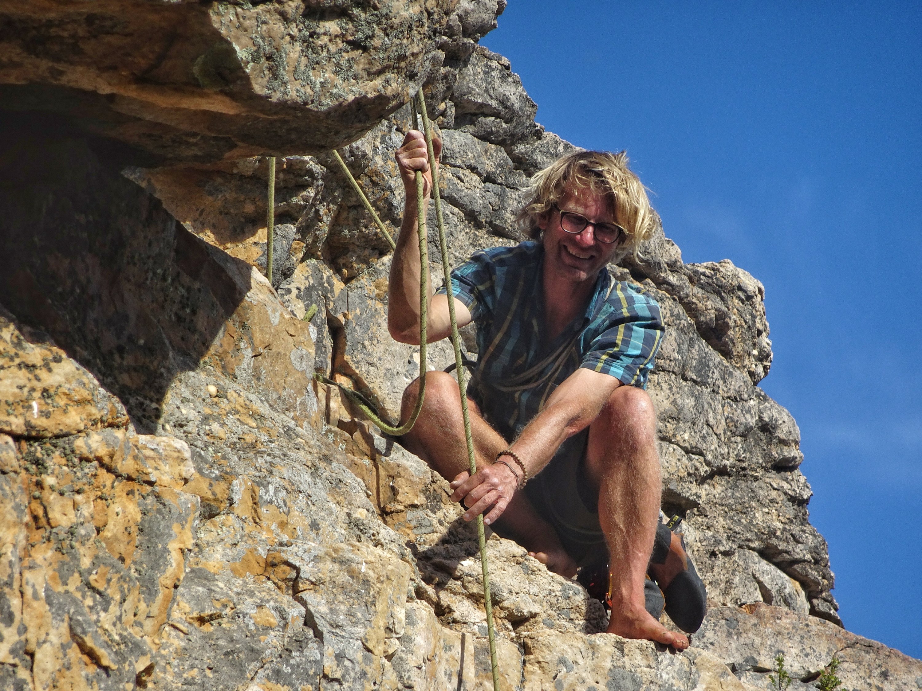 Georg platziert eine “Nuss”. Daran hängt unter Umständen unser Leben.Ich mache den 80ern Konkurrenz mit meinem Outfit. An meinem Gurt die Extrakilos, die man mit hochschleppt. Wer als letzter klettert muss das wieder abbauen.Und wie kommt man wieder runter?!!?