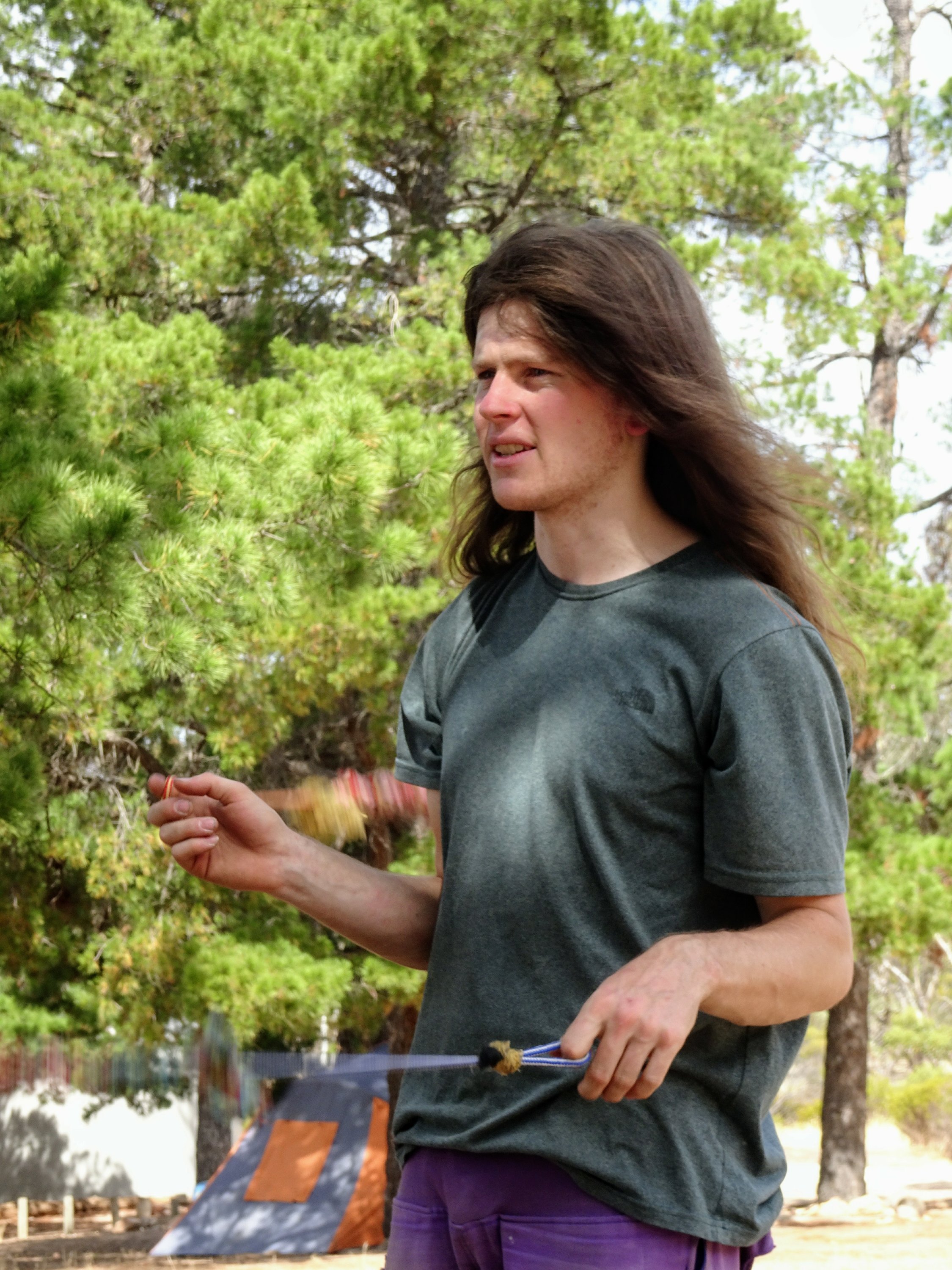 Dann Yasha, alias Ninja. Ich sah ihn oft wie einen asiatischen Mönchskrieger auf seiner Slackline üben. Zusammen mit meinen anderen Freunden hatten wir oft tuschelnd, mit offenen Mündern und weiten Augen in der Ferne gesessen und beobachtet, was noch nie jemand von uns je gesehen oder für möglich gehalten hatte: der Gurt hing ohne jegliche Spannung und berührte beinahe den Boden und er glitt darauf herum und machte noch dazu darauf Kampfsport, als gäbe es keine Schwerkraft. Er war Georgs „Haupt-Buddy“, blieb aber stets für sich und pflegte wenige soziale Kontakte. Durch seine übermenschlichen Superkräfte wirkte er unnahbar, doch nun hatte auch er auf einmal ein Loch zu füllen und sprach mich an, ob wir klettern gehen sollten. Ich konnte es nicht fassen, dieser Superhero, der viel schwerer kletterte als ich, würde sich doch nur langweilen! Doch wir hatten viel mehr Spaß als erwartet und gerade als ich bereit war, abzureisen, bot sich eine weitere großartige Chance an, die ich unmöglich vergehen lassen konnte: einer der lokalen Kletter-Weisen, bot mir an mit ihm zu klettern und mir den Vorstieg beizubringen. Wowww, ich fühlte mich so reich beschenkt vom Leben. Simon, der seit den 80ern hier klettert, erfahrener Kletterguide ist und Autor der Routenführer, die jeder benutzt, kostet normalerweise 350 Dollar am Tag. Da bietet er mir einfach so an, mir ein paar Tips zu geben! Dafür war ich mehr als bereit meinen Aufenthalt zu verlängern. Zwei halbe Tage nahm sich Simon Zeit mir Privatunterricht zum Christbaumschmuck zu geben. Es machte sooo Spaß! An den Nachmittagen ging ich mit Yasha an einfachen Routen üben, was Simon mit gezeigt hatte, diesmal war ich der Vorsteiger. So ein Unterschied! War eine 11 als Nachsteiger ein Klacks (da kletterte ich inzwischen Grad 17 bis 18), war es im Vorstieg doch nochmal ne andere mentale Nummer! Ich begriff warum Meditation auch für Kletterer ein Riesenplus ist.
