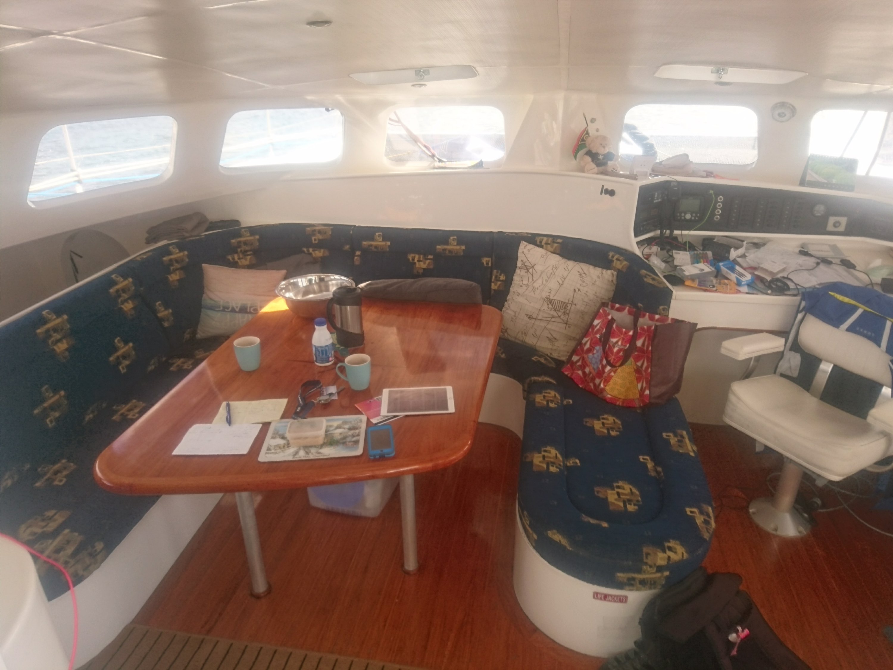 Der Salon.Meine „Kajüte“ ist eher ein „Zimmer“Seit Donnerstag sind wir unterwegs und „ueben“ entlang der Kueste.Und Delphine begleiten uns.
