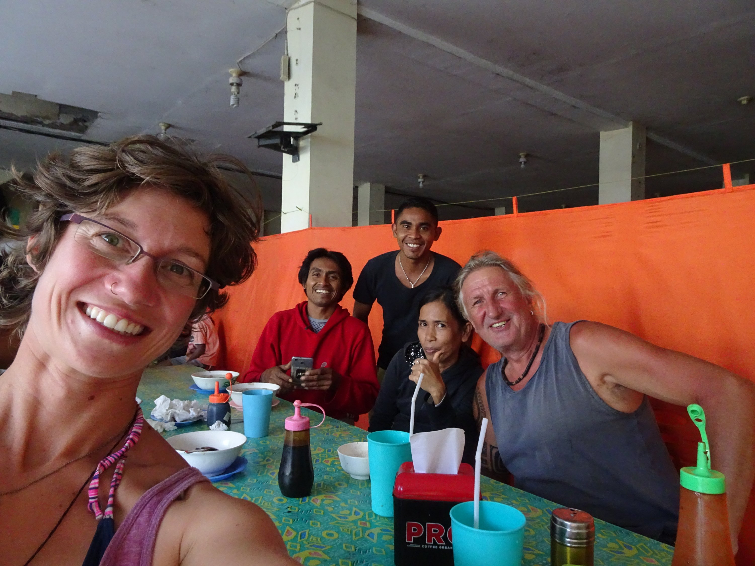 In Kupang gibt es noch wenig Tourismus und wir wurden immer wieder gefragt, ob man mit uns ein Selfie machen dürfe. Wie auch hier in einer Straßenküche, wie ich sie am liebsten mag. Dort essen, wo die Einheimischen essen. Das ist bislang immer das leckerste gewesen und sehr günstig.