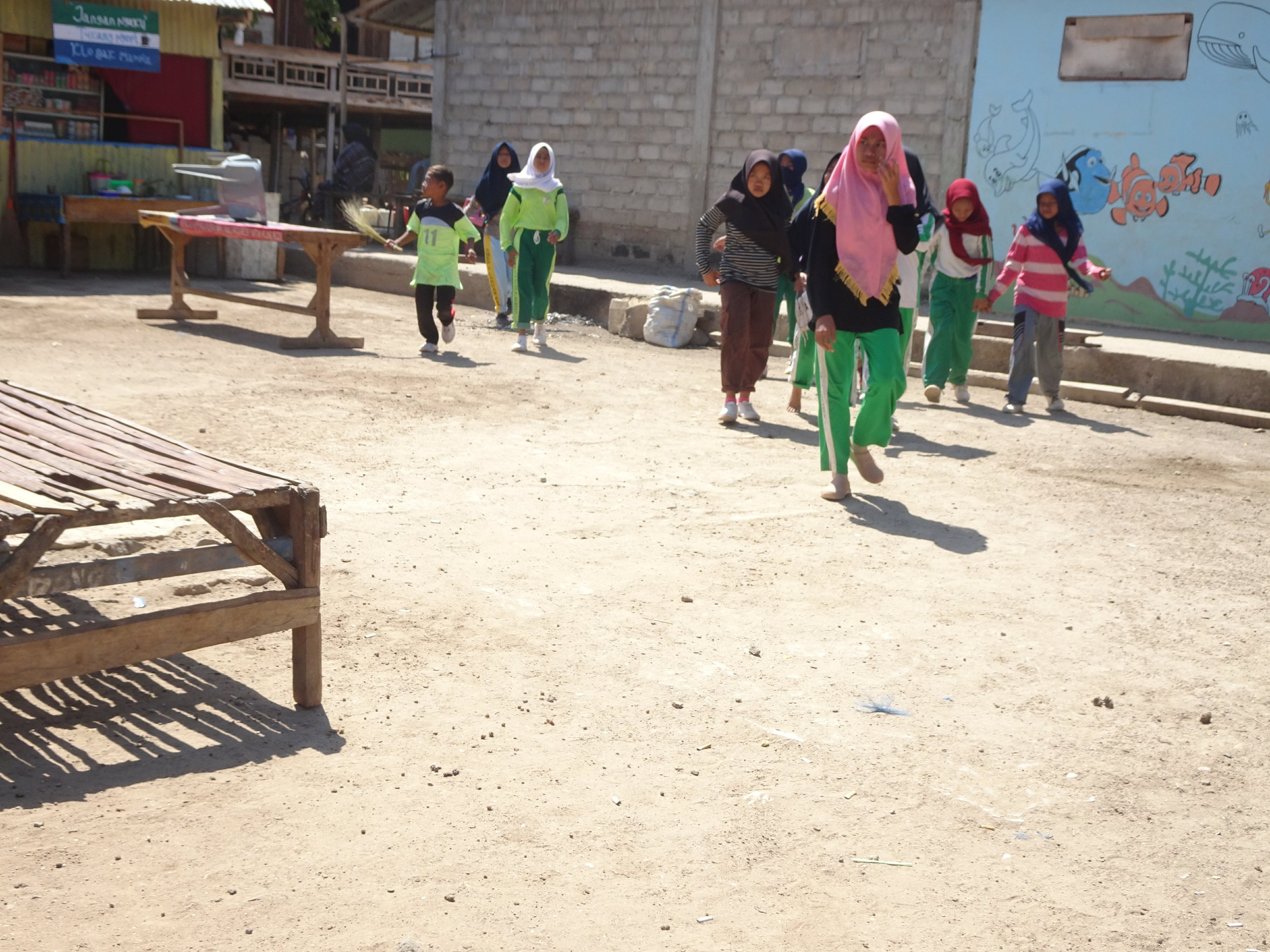 Ein Hüftschuss im Dorf von Komodo. Die Mädchen sind verschleiert und die Jungs tragen Gebetskappen.
