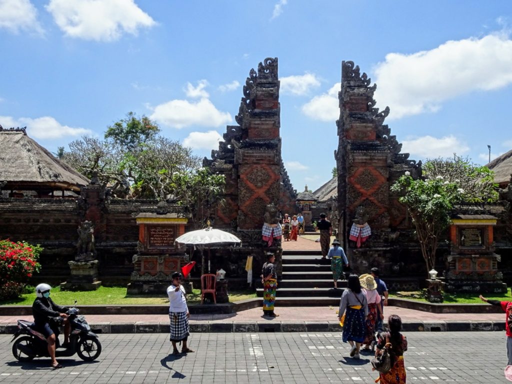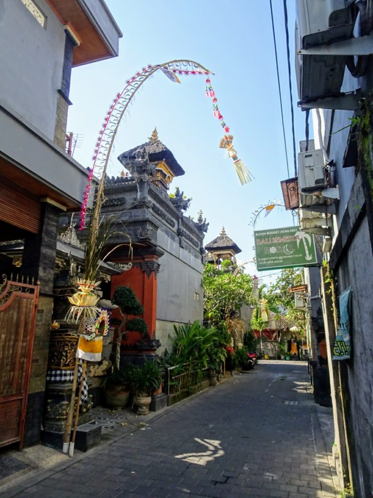 Eine typische Nebengasse in einem Viertel von Denpasar, der Hauptstadt von Bali. Links der Eingang zu einem Wohnhaus, wie ihr seht aufwendig verziert und mit einem kleinen Opferaltar aus Bambus versehen.